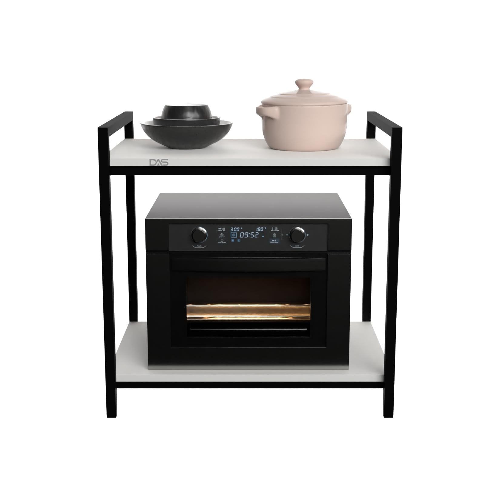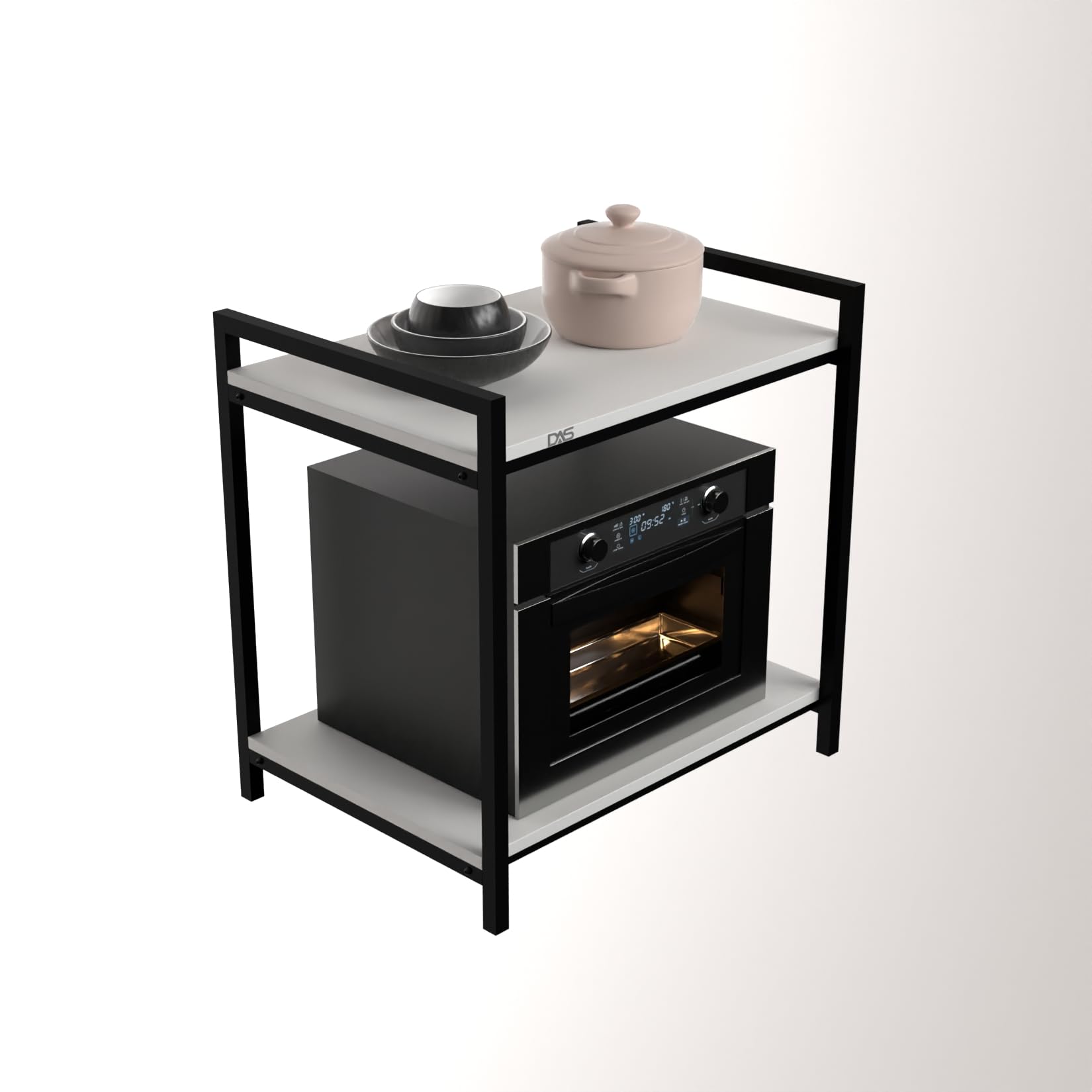 STRONG CONSTRUCTION & STURDY DESIGN: Well engineered metal frame offers stability and load bearing capacity to this microwave stand. Food, pots and pans, dishes, cups, and other kitchen accessories can be place on the top tier of this stand. This shelf reduces clutter and adds extra storage space in your kitchen. The compact design occupy’s the smallest space in your kitchen, make your messy space clean and tidy.