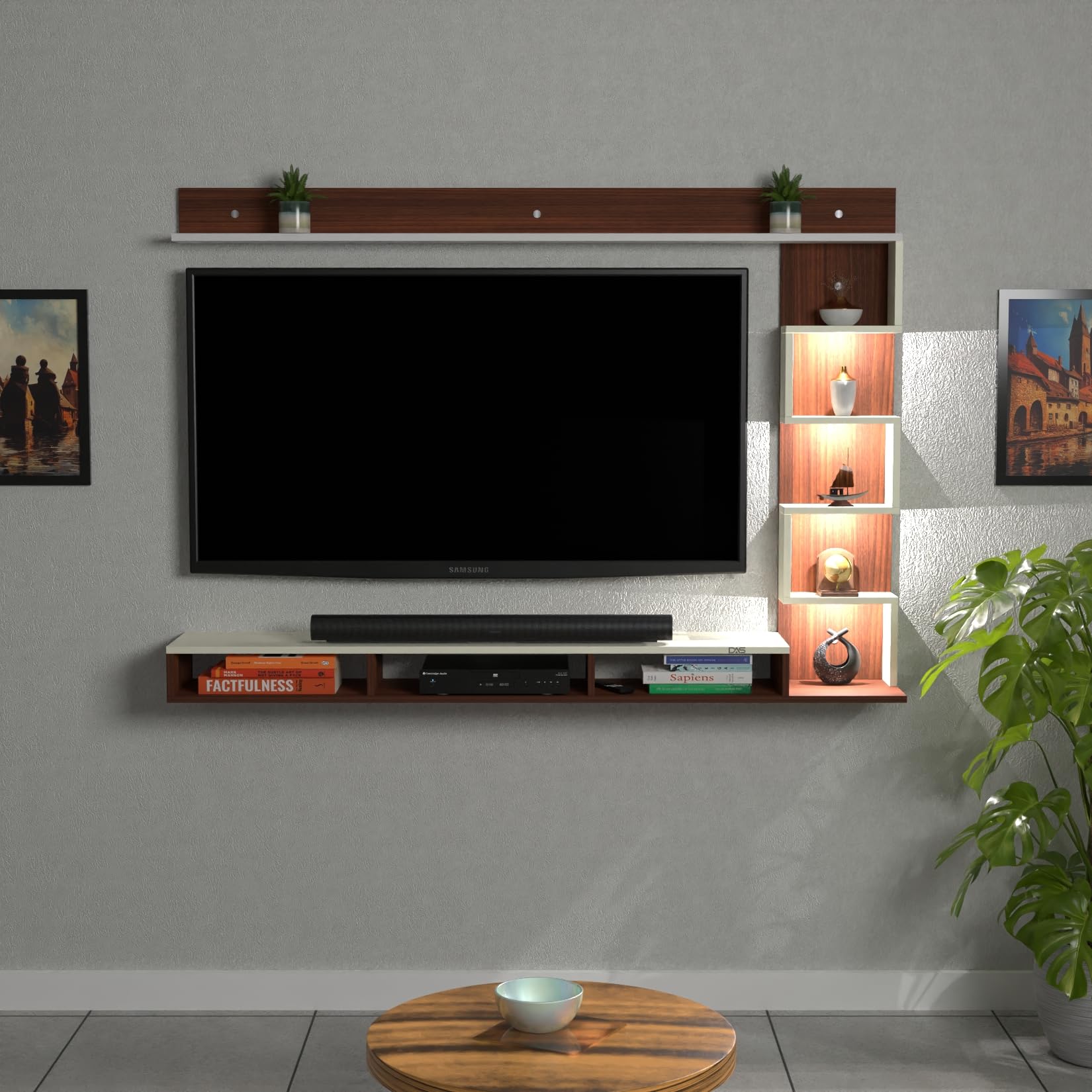 Aaron LED Light Installed Wall Mount Engineered Wood TV Entertainment Unit/Tv Rack with Wall Shelves for Living Room Classic Walnut & Frosty White (Ideal for up to 43″)