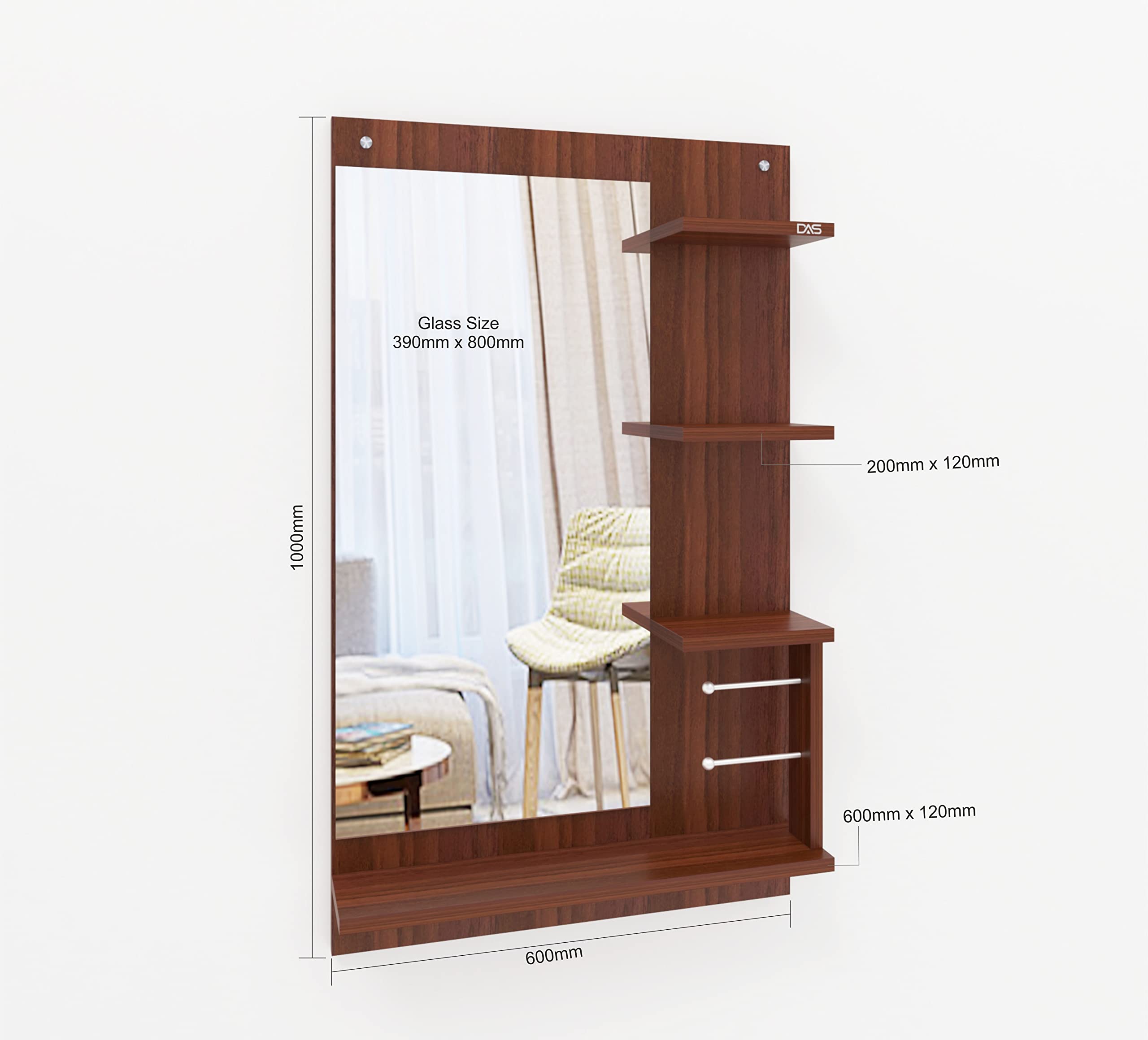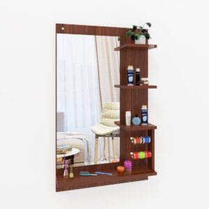 Material- Engineered Wood, Glass and Stainless Steel. Product Dimensions- Wooden Frame- 100 x 60 cm, Mirror- 80 x 39 cm. Weight- 13 kg.