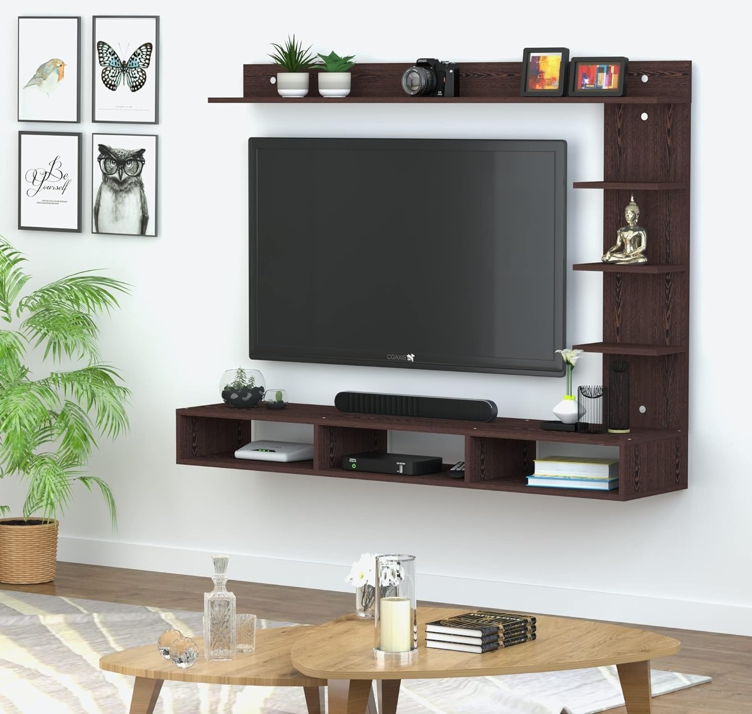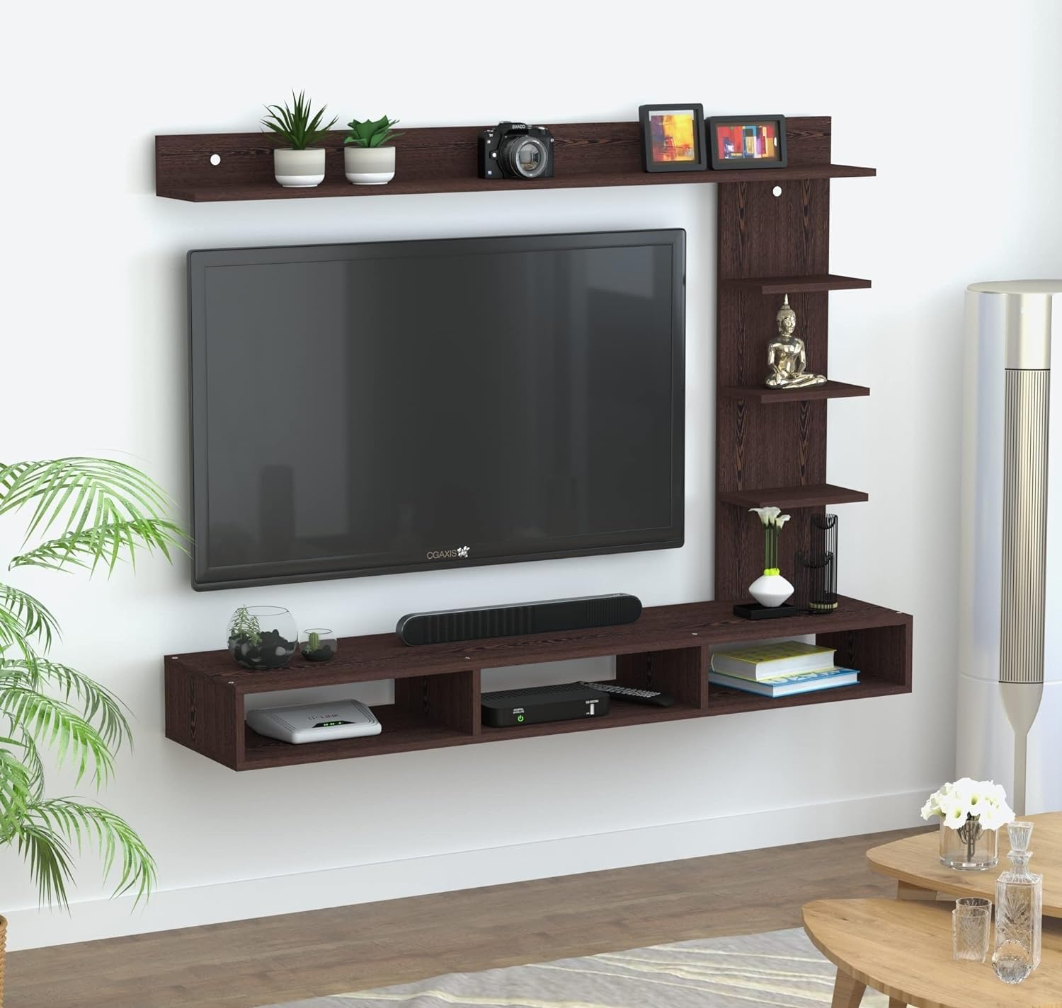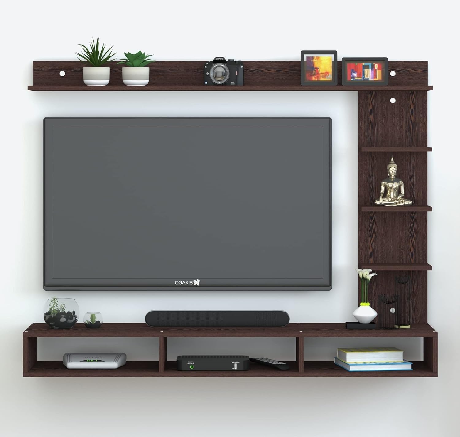 Wall Mount Engineered Wood TV Entertainment Unit is a sleek and modern solution for organizing your media space. Designed for contemporary living rooms, it includes a sturdy TV rack, set-top box stand, and complementary wall shelves that together create a clean and organized display. Crafted from high-quality engineered wood, this unit offers durability and long-lasting performance. The floating design not only saves space but also adds a touch of elegance to your wall. It is perfect for holding your television, remote controls, dΓ©cor items, and entertainment accessories, helping to keep your living area clutter-free and stylish. Ideal for modern homes, it blends functionality with visual appeal.