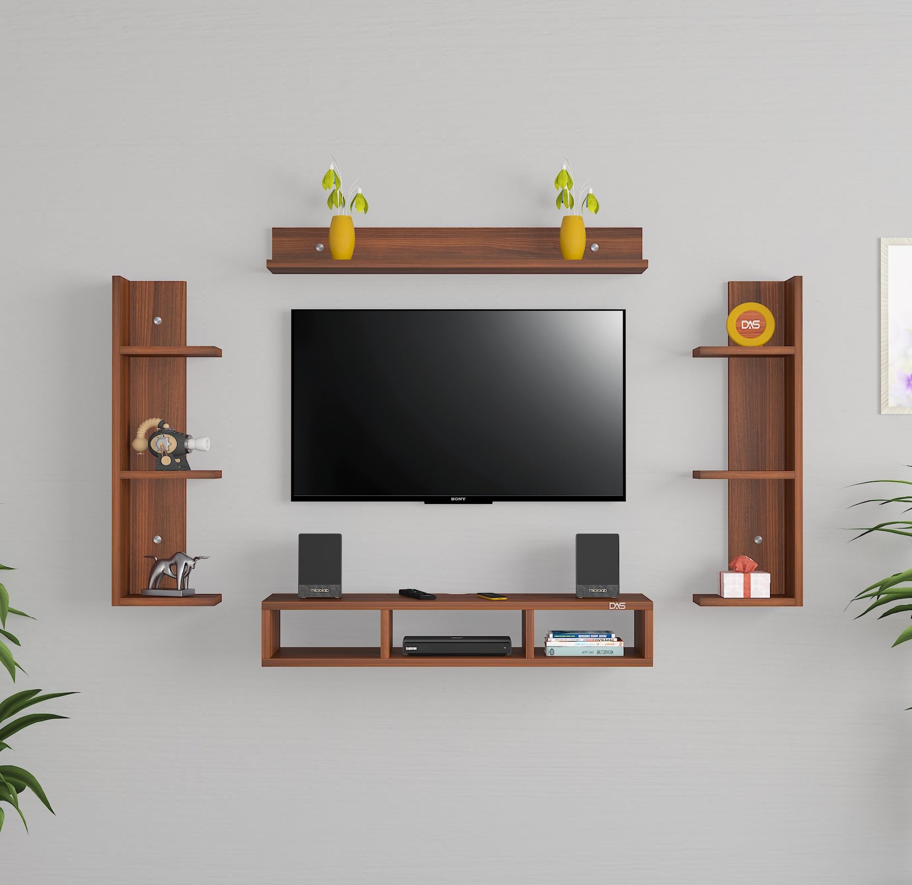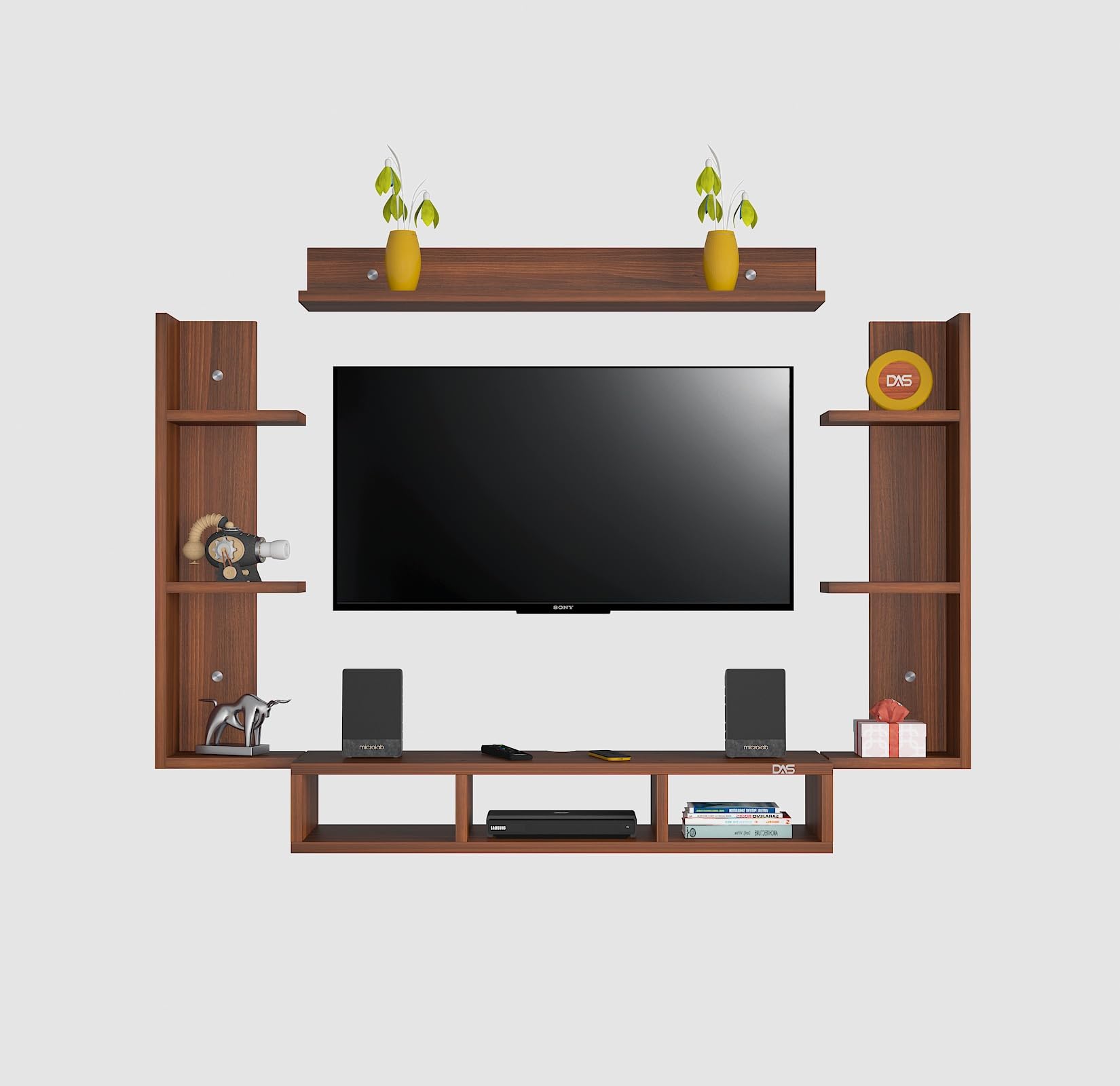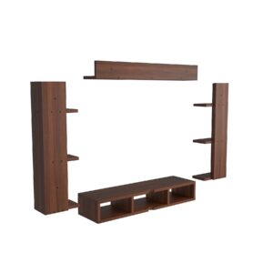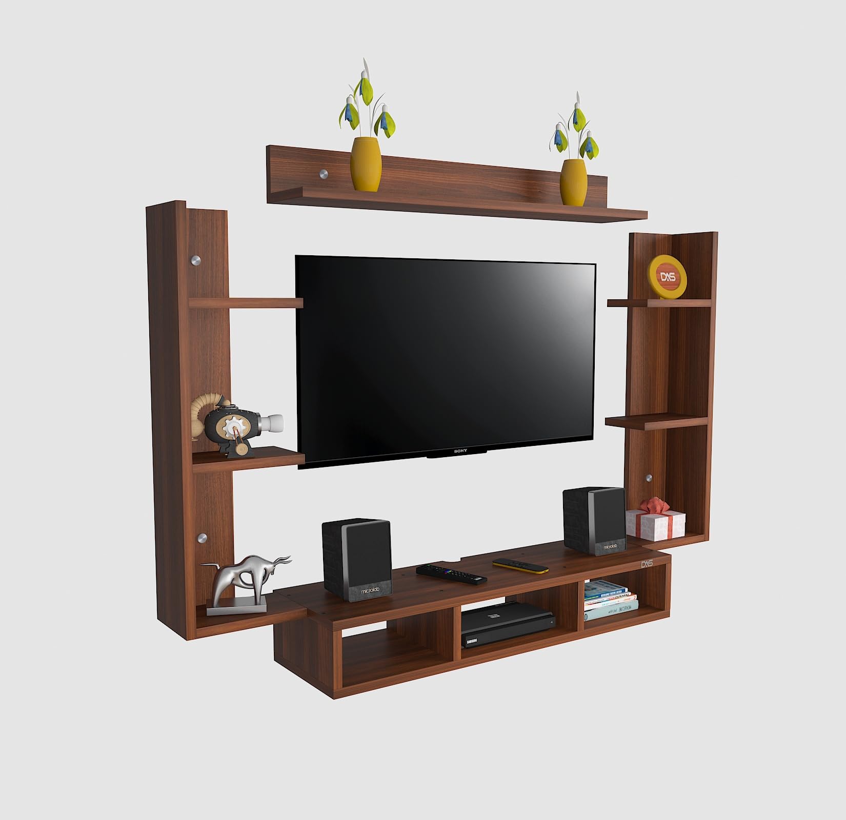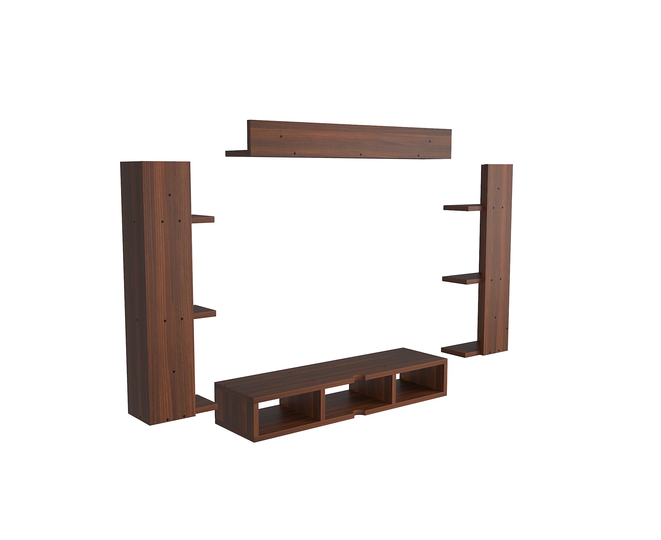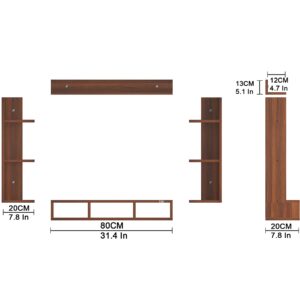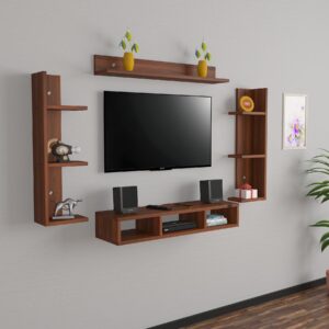 Material- Pre-laminated particle baord. Weight Capacity- 20 KG. Cable Management. Product Dimension- TV Cabinet- 80 x 20 x 15 CM, Wall Shelf- 20 x 12 CM, Shelf supporting Unit- 70 x 12.5 CM, Pop Out Shelf- 80 x 12 cm Weight- 10 KG
