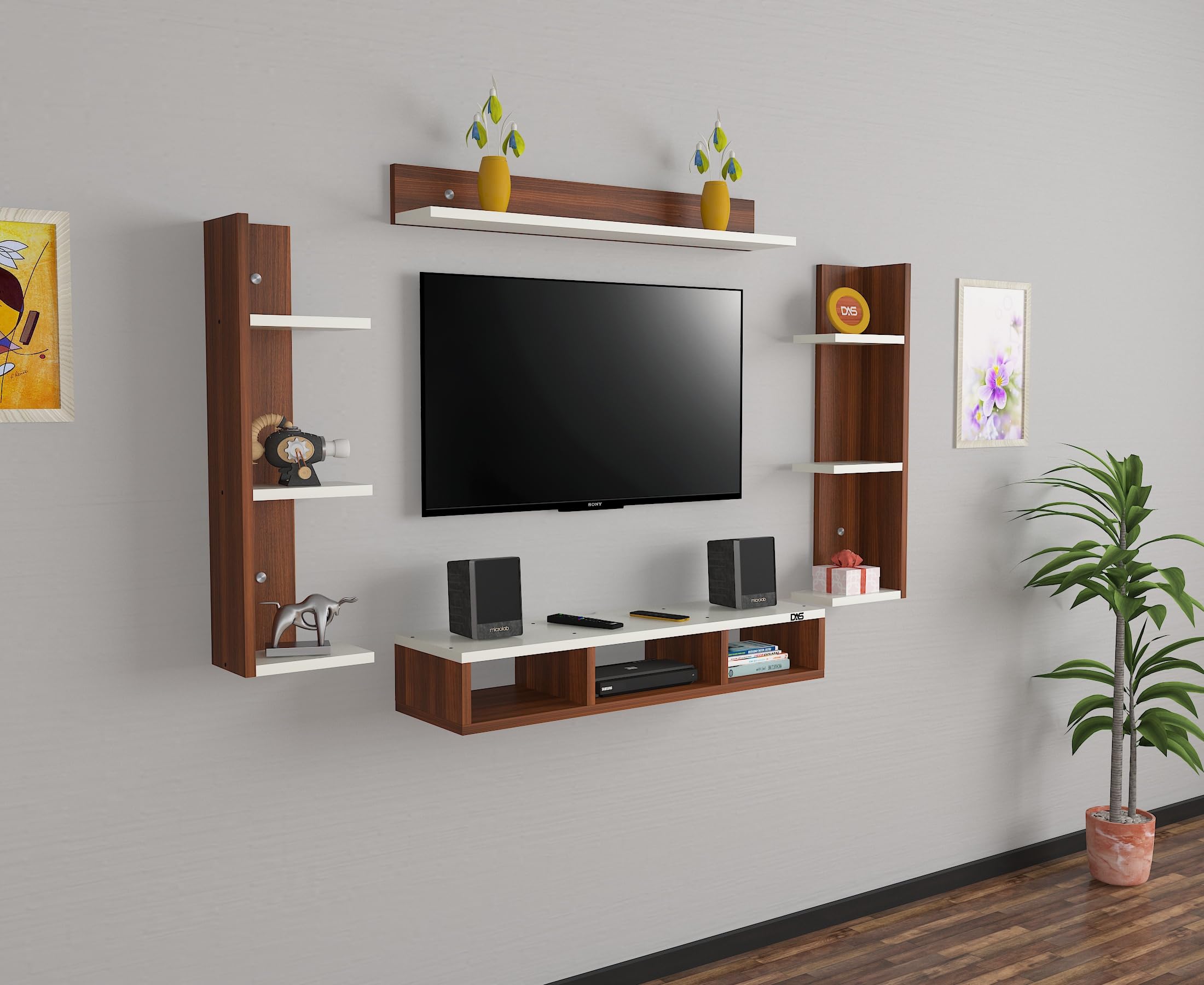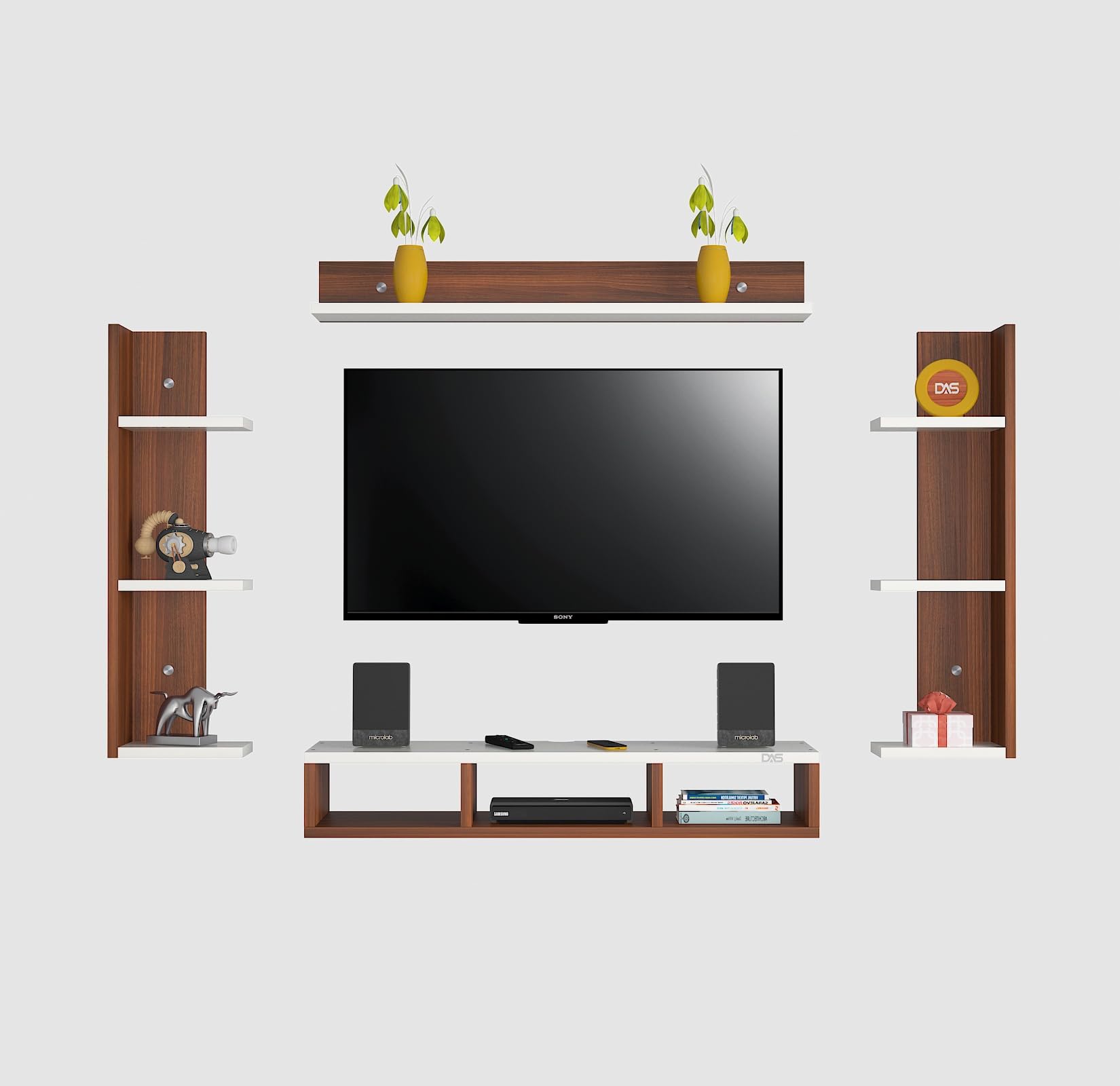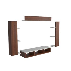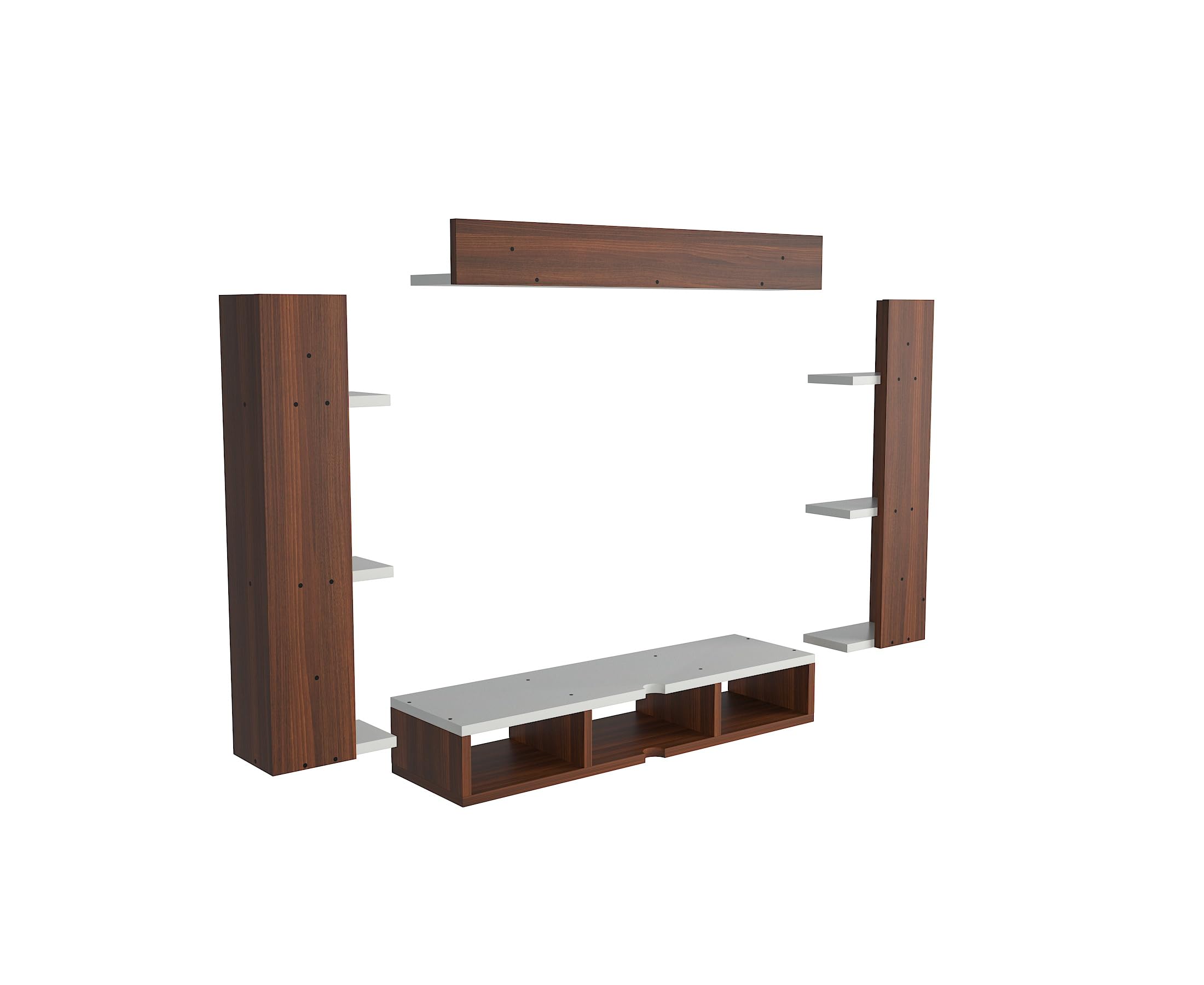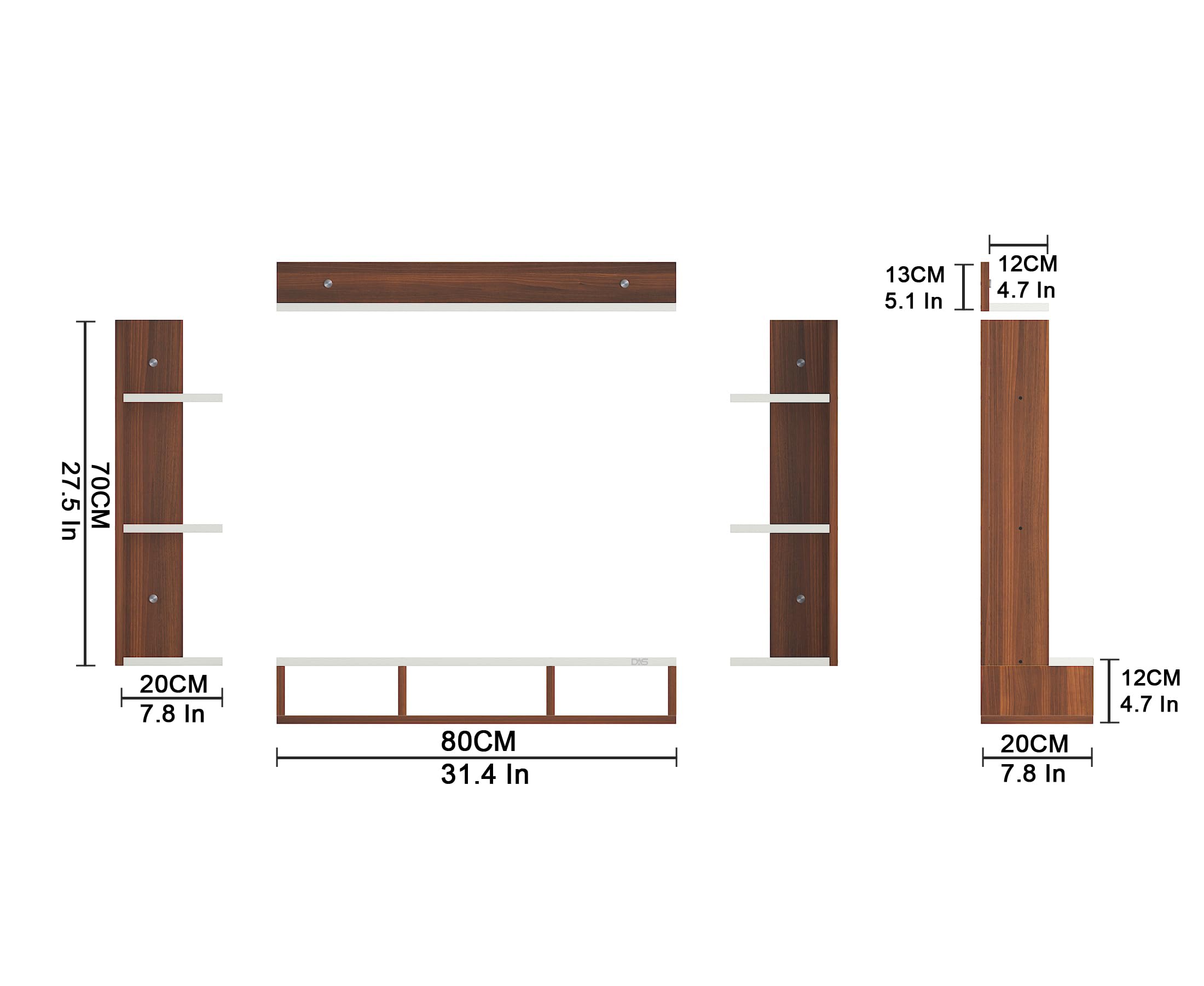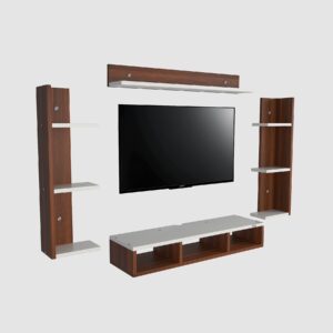 Material- Pre-laminated particle baord. Weight Capacity- 20 KG. Cable Management. Product Dimension- TV Cabinet- 80 x 20 x 15 CM, Wall Shelf- 20 x 12 CM, Shelf supporting Unit- 70 x 12.5 CM, Pop Out Shelf- 80 x 12 cm Weight- 10 KG