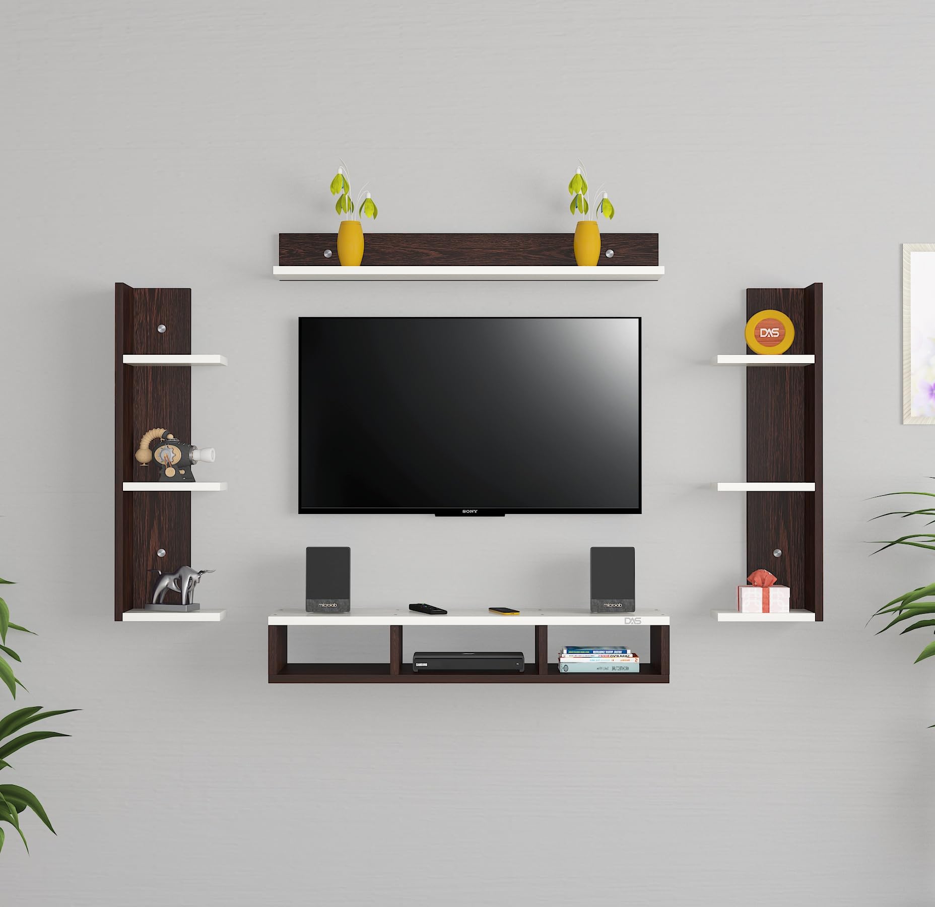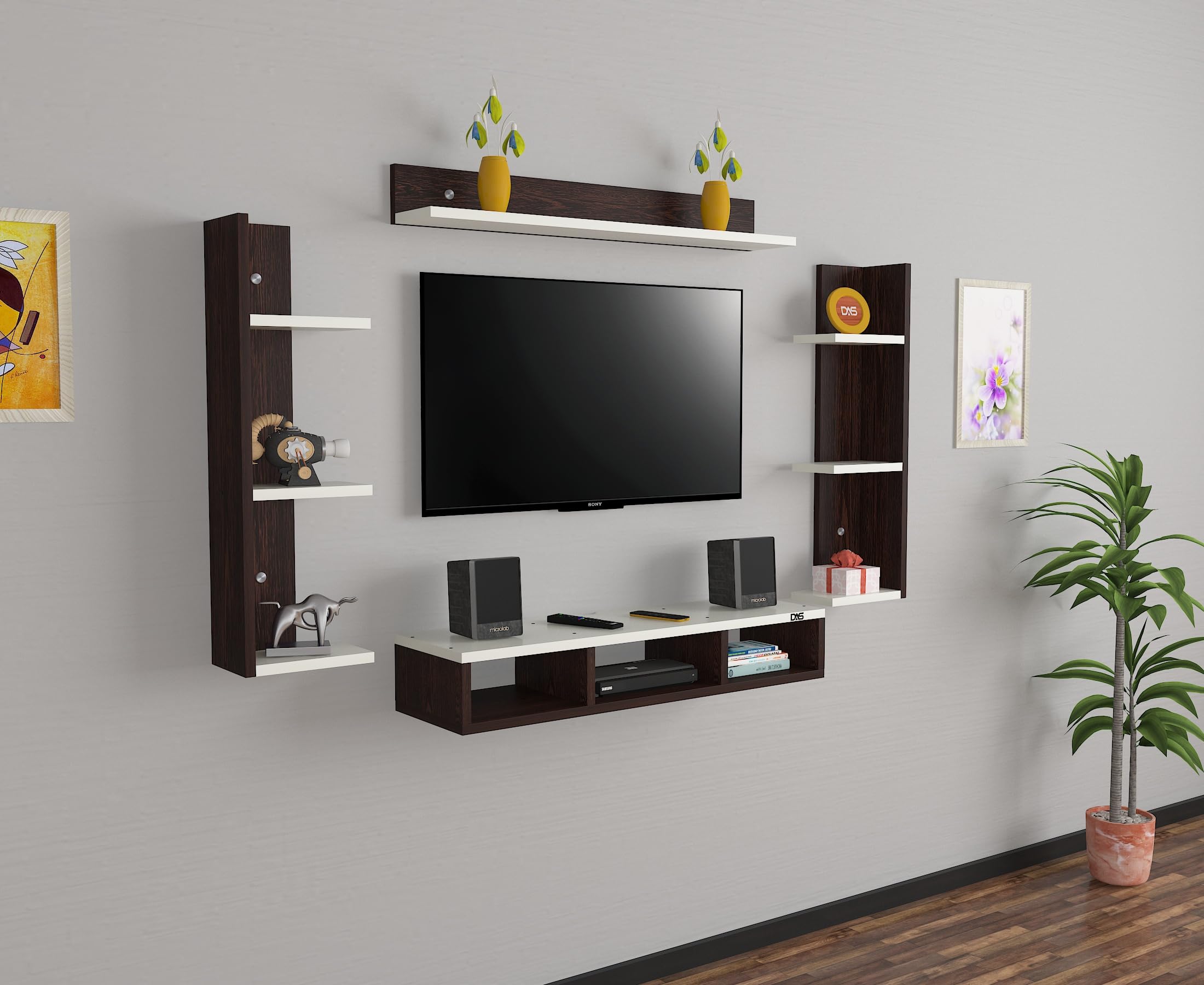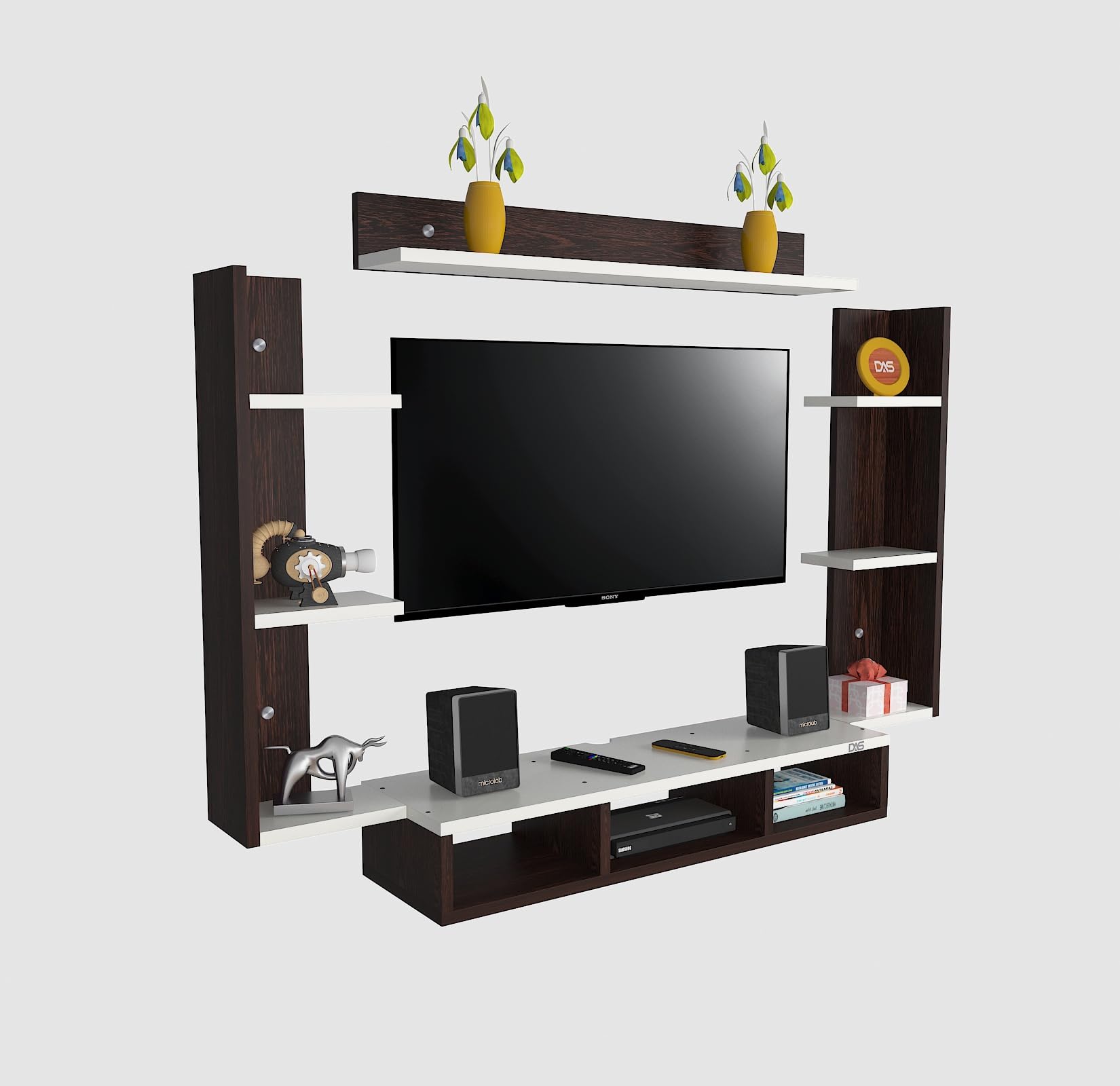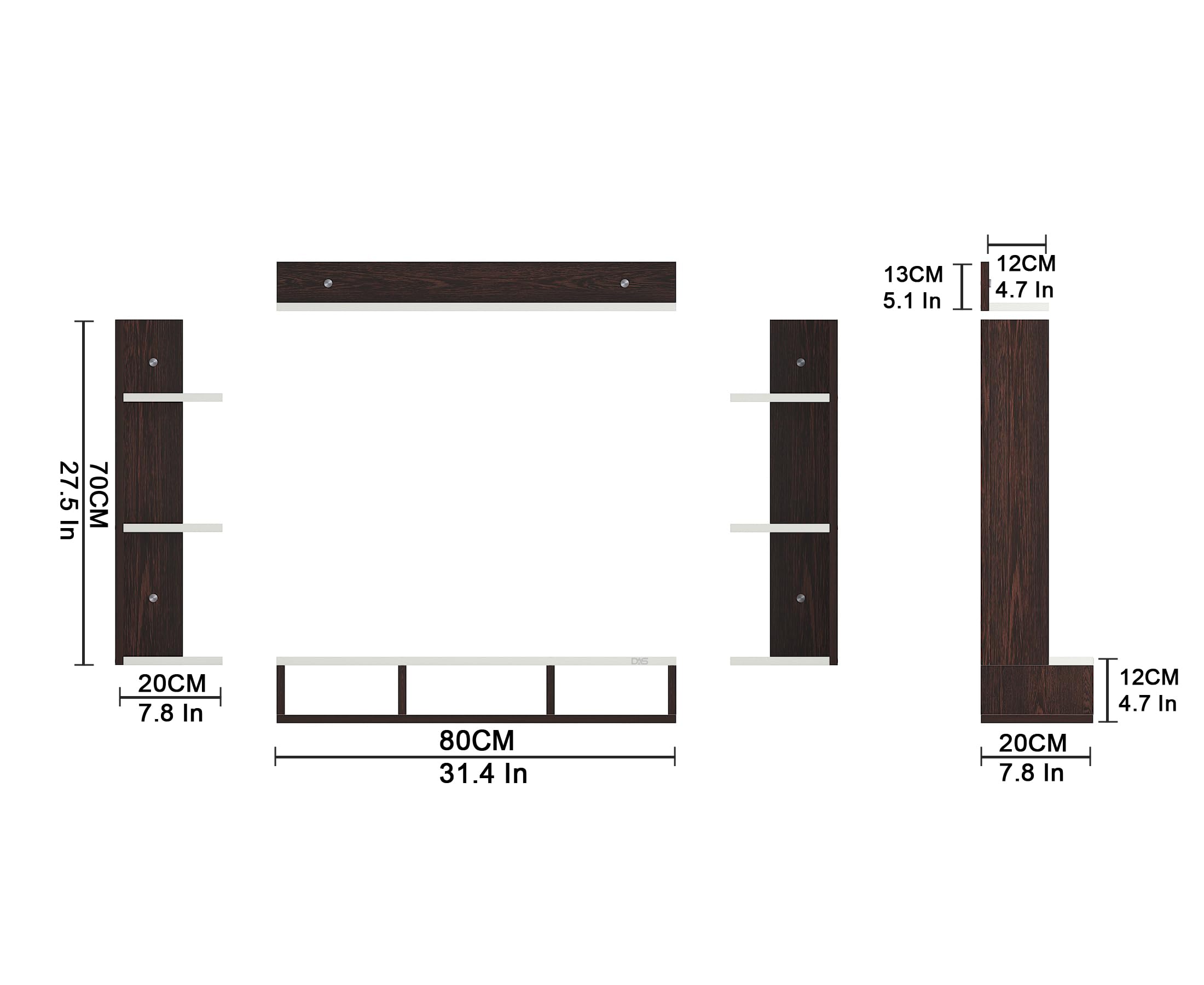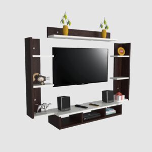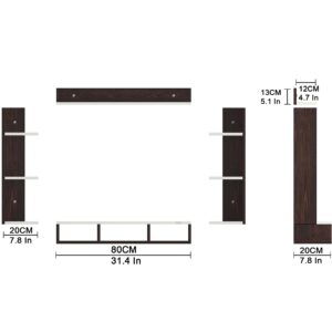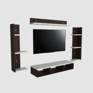 Material- Pre-laminated particle baord. Weight Capacity- 20 KG. Cable Management. Product Dimension- TV Cabinet- 80 x 20 x 15 CM, Wall Shelf- 20 x 12 CM, Shelf supporting Unit- 70 x 12.5 CM, Pop Out Shelf- 80 x 12 cm Weight- 10 KG
