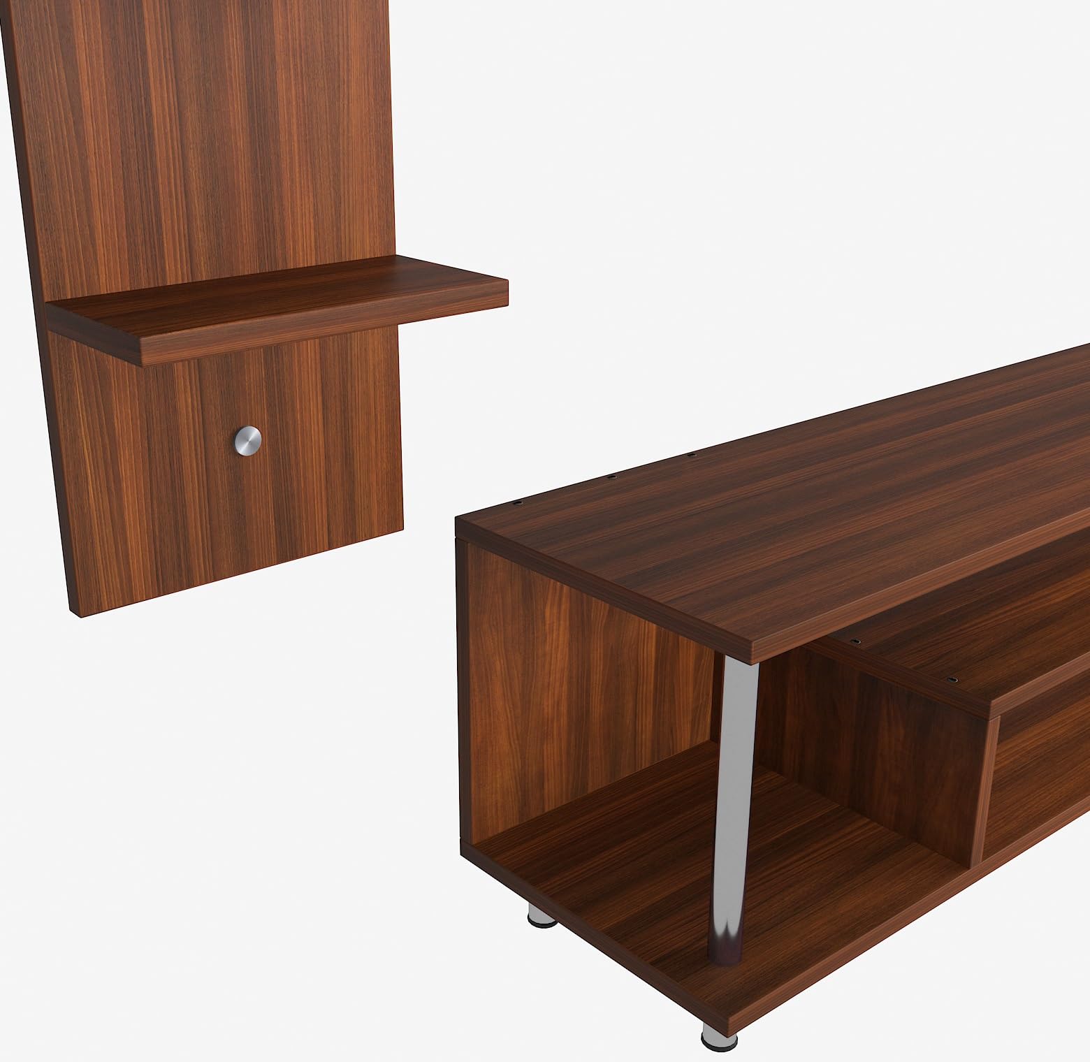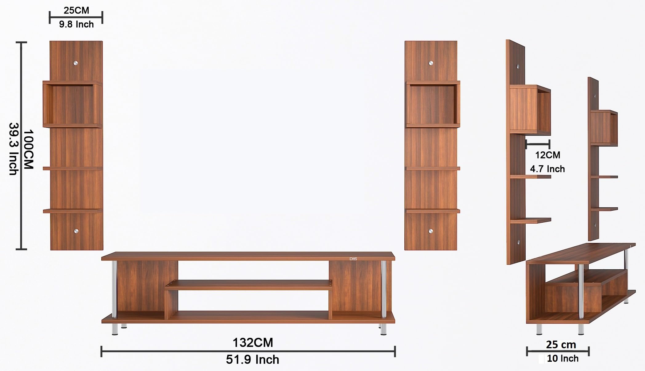 Material- Pre-laminated particle baord. Weight Capacity- 25 KG. Cable Management. Product Dimension- TV Cabinet- 132 x 25 x 40 CM, Wall Shelf- 25 x 12 CM, Shelf supporting Unit- 100 x 25 CM, Weight- 19 KG
