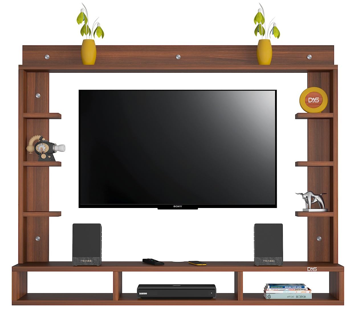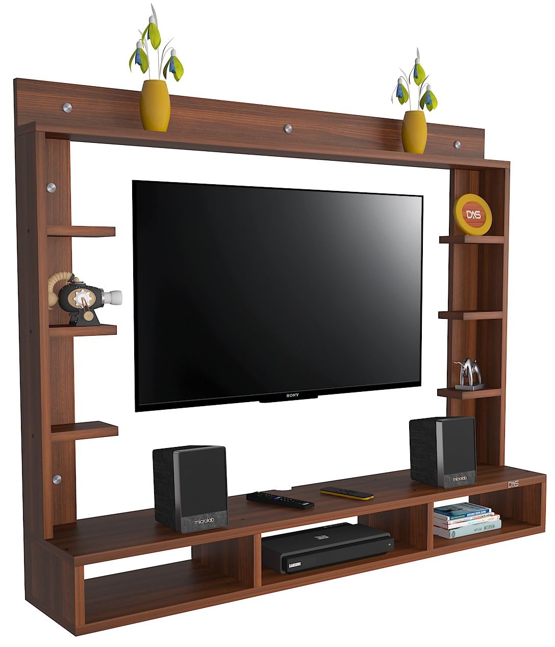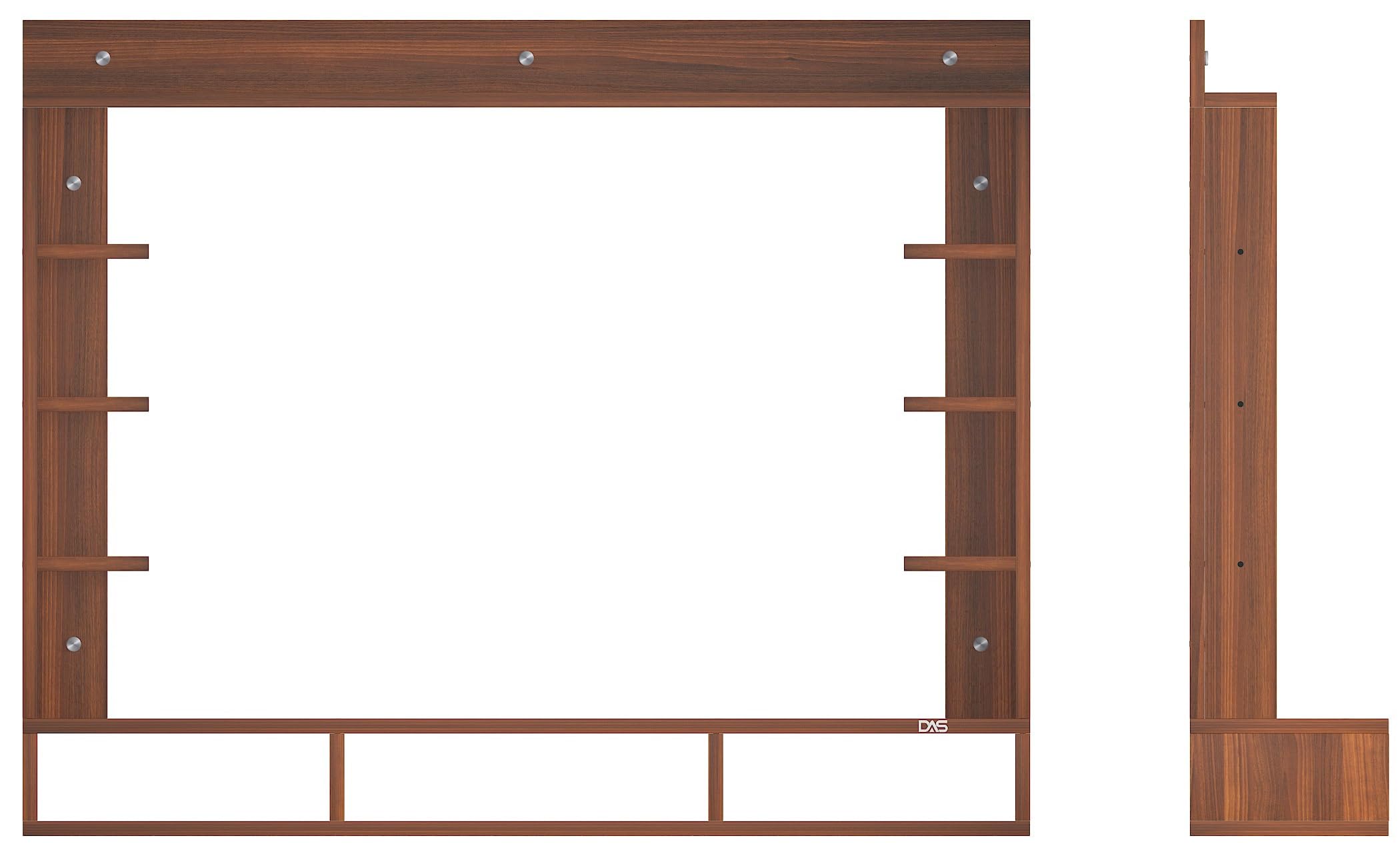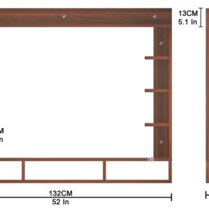 Material- Pre-laminated particle baord. Weight Capacity- 25 KG. Cable Management. Product Dimension- TV Cabinet- 132 x 23 x 15 CM, Wall Shelf- 15 x 12 CM, Shelf supporting Unit- 80 x 13.5 CM, Pop Out Shelf- 132 x 12 cm Weight- 19 KG