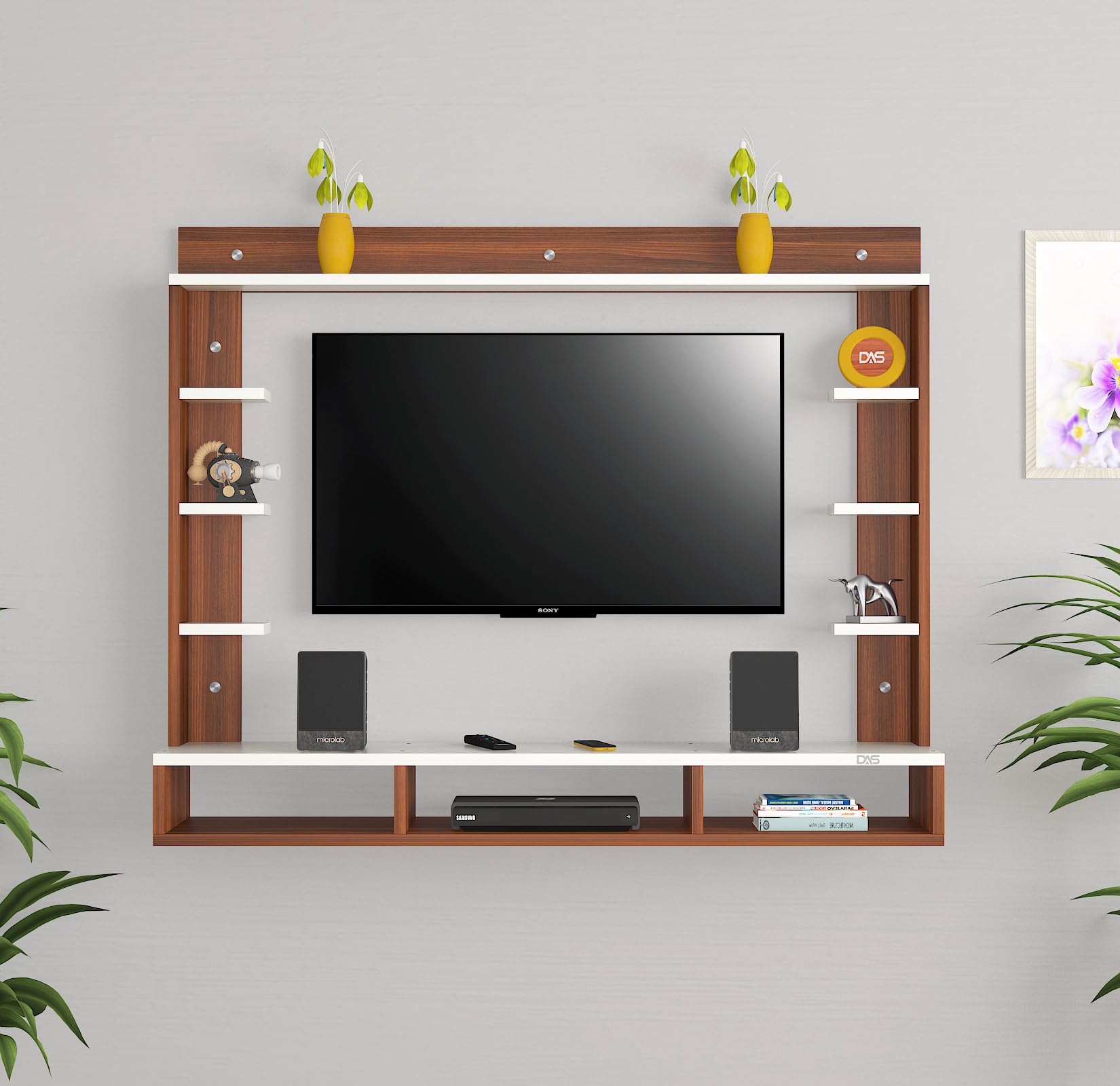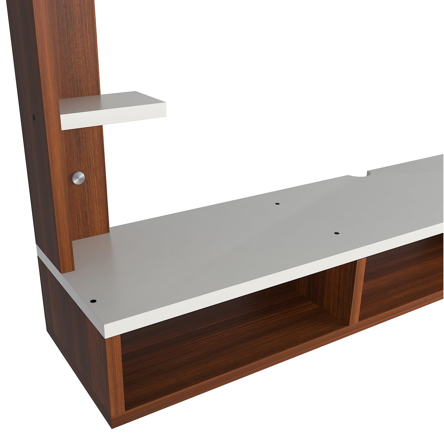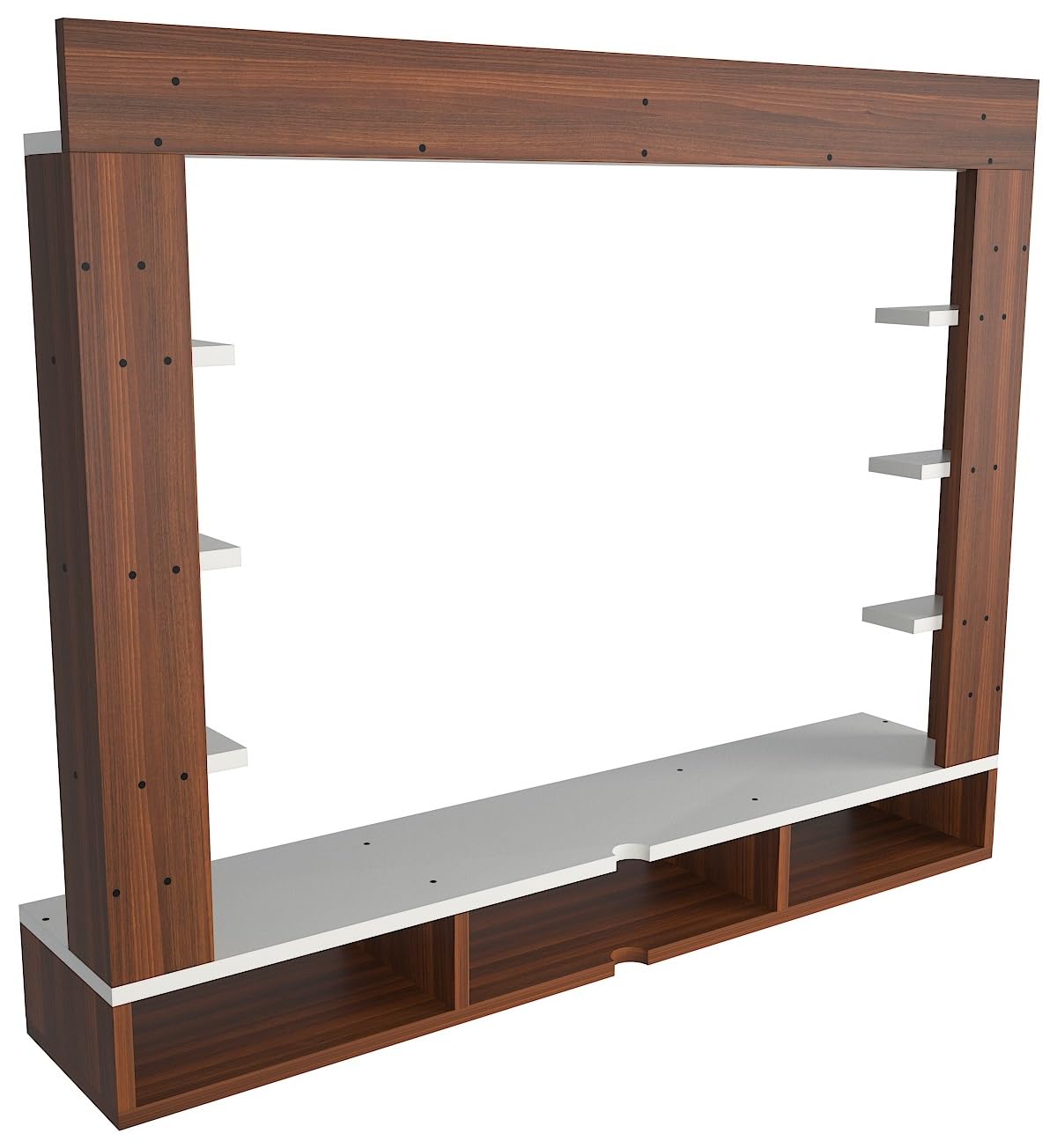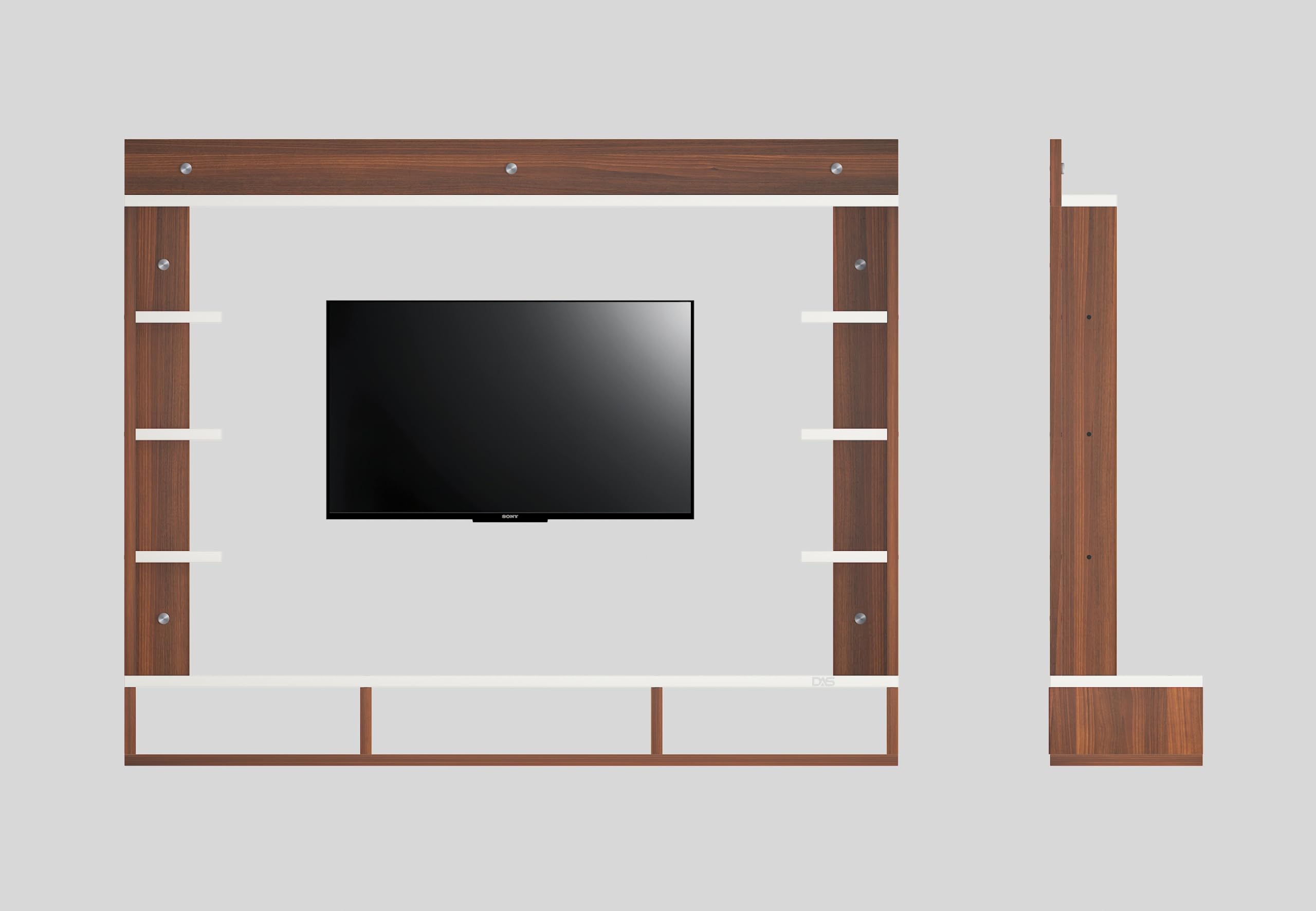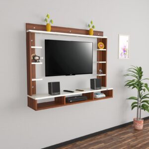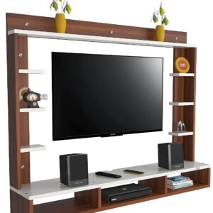 Material- Pre-laminated particle baord. Weight Capacity- 25 KG. Cable Management. Product Dimension- TV Cabinet- 132 x 23 x 15 CM, Wall Shelf- 15 x 12 CM, Shelf supporting Unit- 80 x 13.5 CM, Pop Out Shelf- 132 x 12 cm Weight- 19 KG