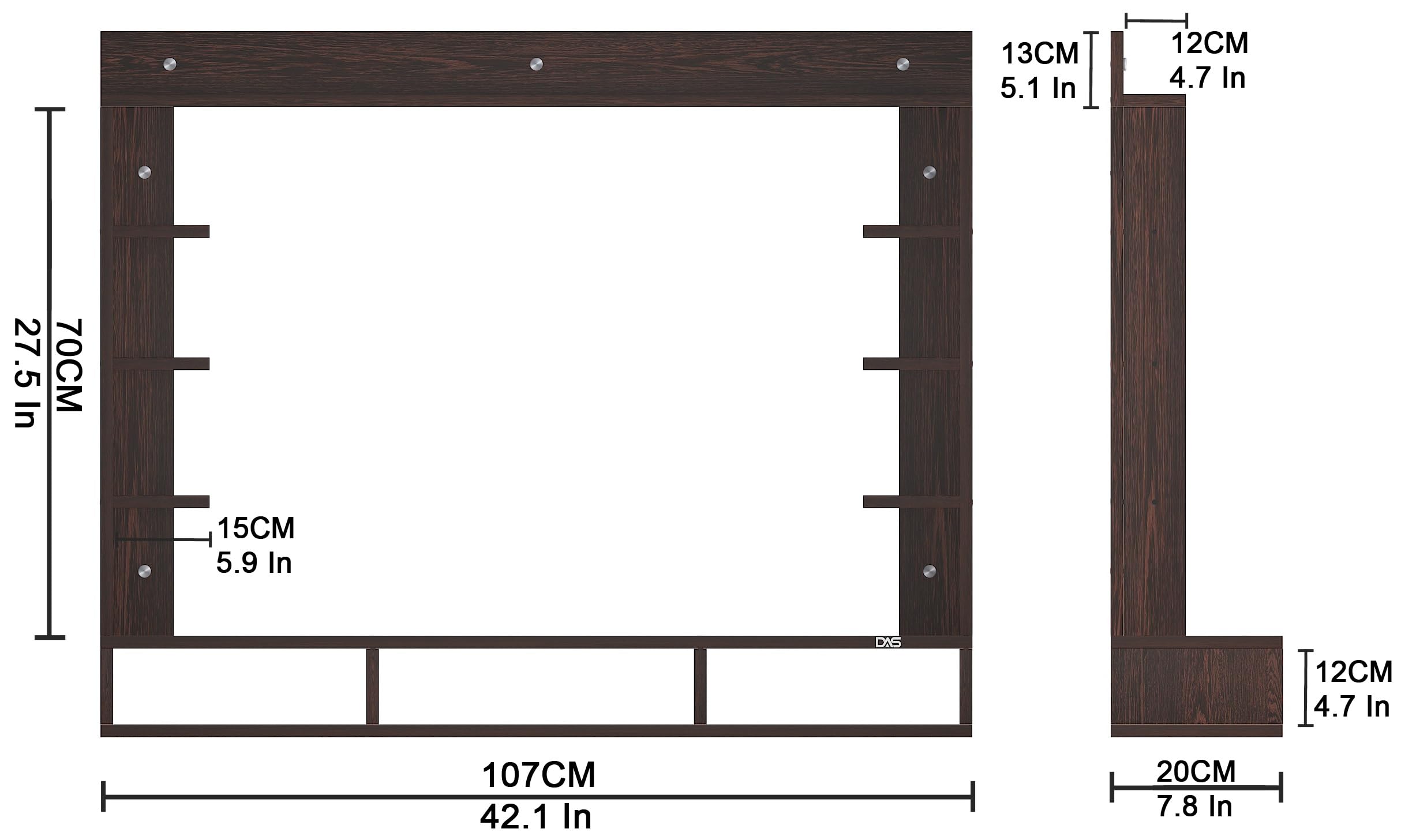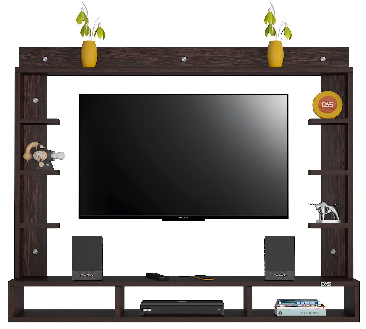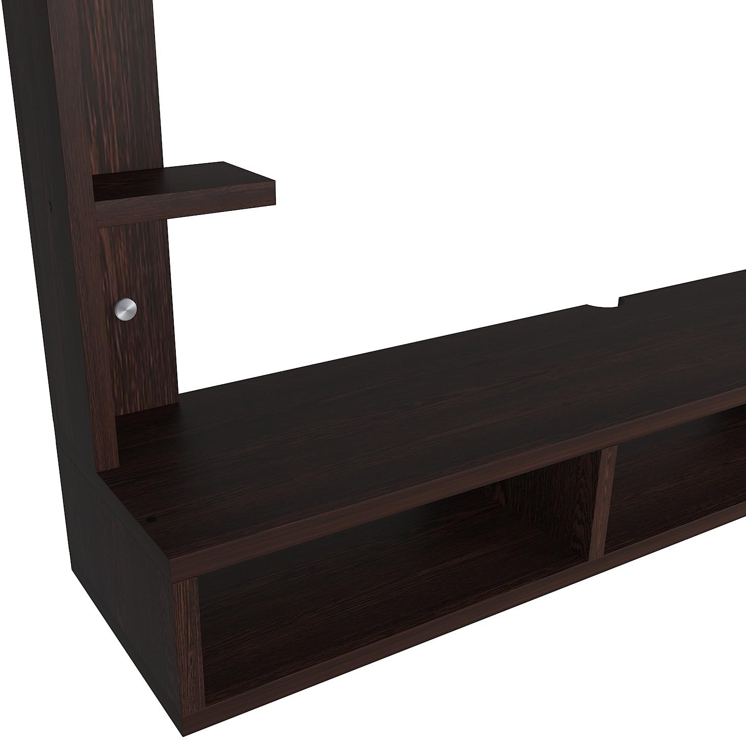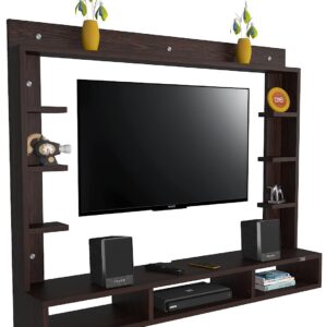 Material- Pre-laminated particle baord. Weight Capacity- 25 KG. Cable Management. Product Dimension- TV Cabinet- 107 x 20 x 15 CM, Wall Shelf- 15 x 12 CM, Shelf supporting Unit- 70 x 13.5 CM, Pop Out Shelf- 107 x 12 cm Weight- 15 KG