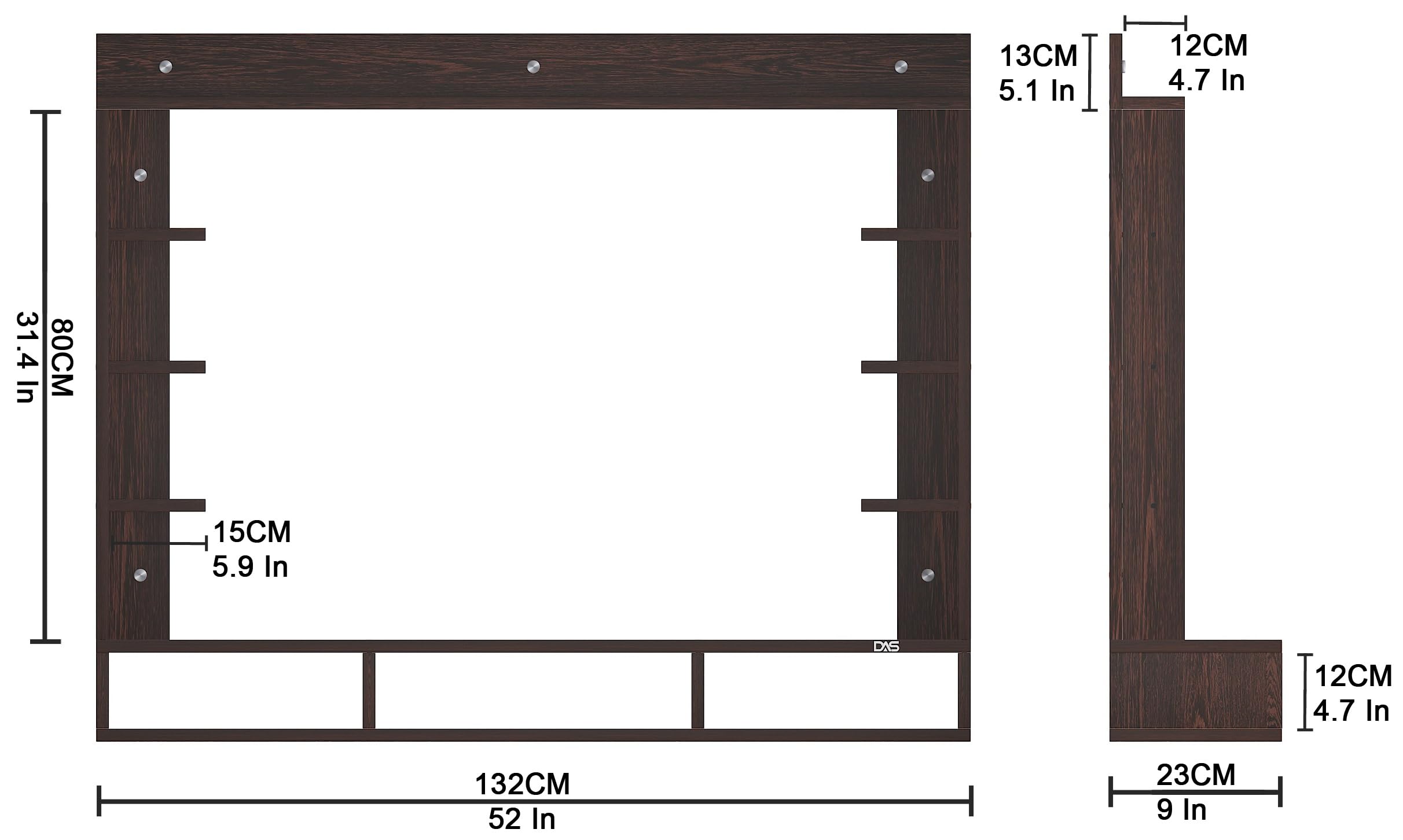 Material- Pre-laminated particle baord. Weight Capacity- 25 KG. Cable Management. Product Dimension- TV Cabinet- 132 x 23 x 15 CM, Wall Shelf- 15 x 12 CM, Shelf supporting Unit- 80 x 13.5 CM, Pop Out Shelf- 132 x 12 cm Weight- 19 KG
