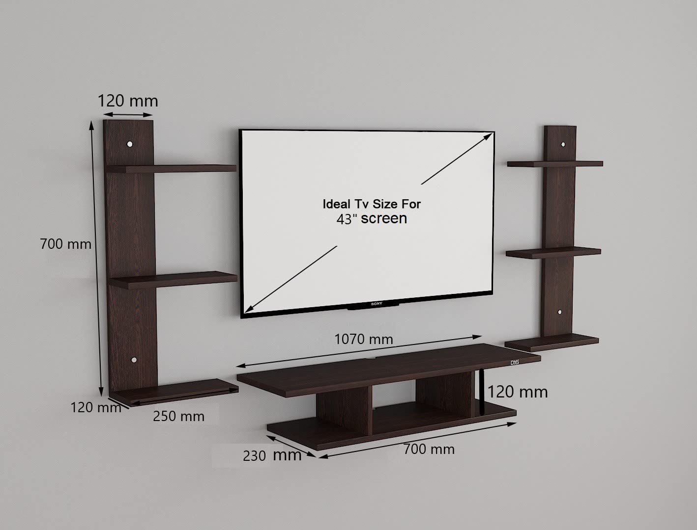 Product Dimensions- Bottom Unit- Length- 107 CM, Breadth- 23 CM, Height- 12 CM, Wall Supporting Shelf- 70 x 12 CM, Wall Shelf- 12 x 25 CM, Product Weight- 9 KG.