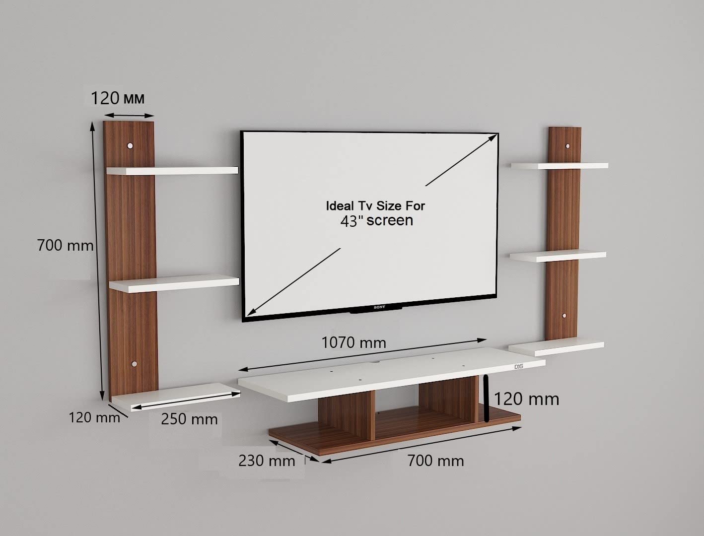 Product Dimensions- Bottom Unit- Length- 107 CM, Breadth- 23 CM, Height- 12 CM, Wall Supporting Shelf- 70 x 12 CM, Wall Shelf- 12 x 25 CM, Product Weight- 9 KG.