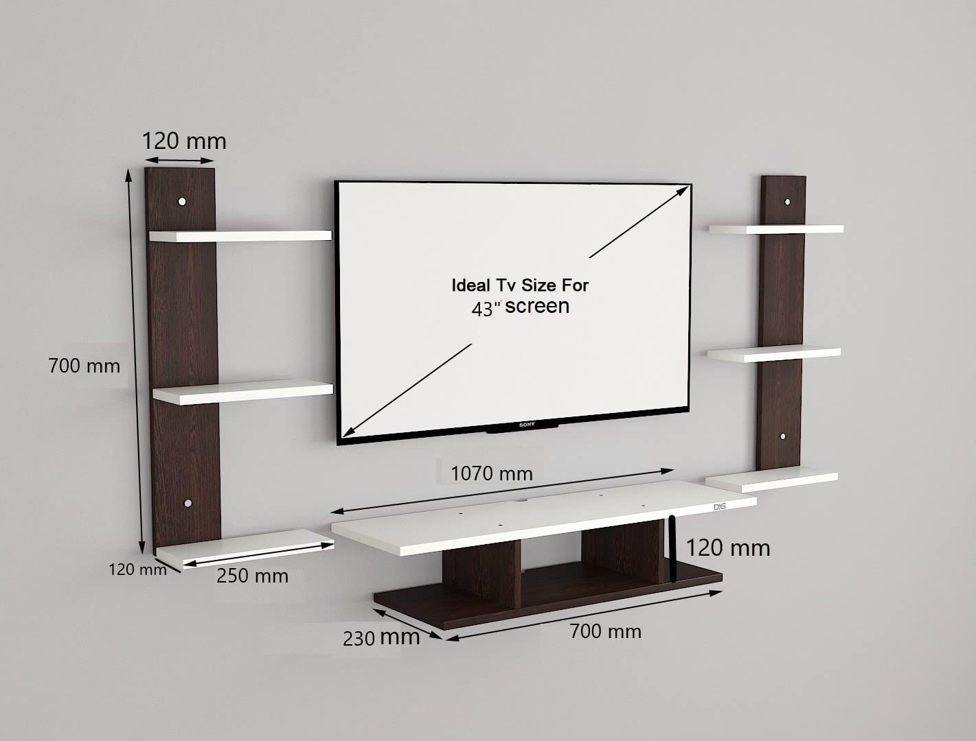 Product Dimensions- Bottom Unit- Length- 107 CM, Breadth- 23 CM, Height- 12 CM, Wall Supporting Shelf- 70 x 12 CM, Wall Shelf- 12 x 25 CM, Product Weight- 9 KG.