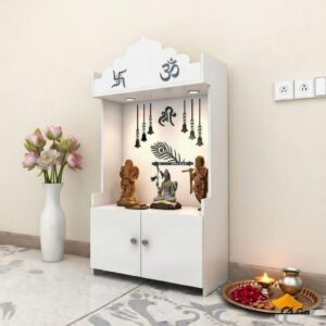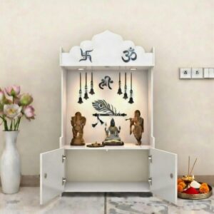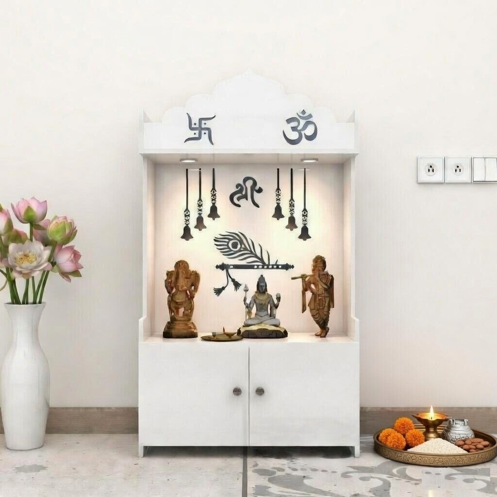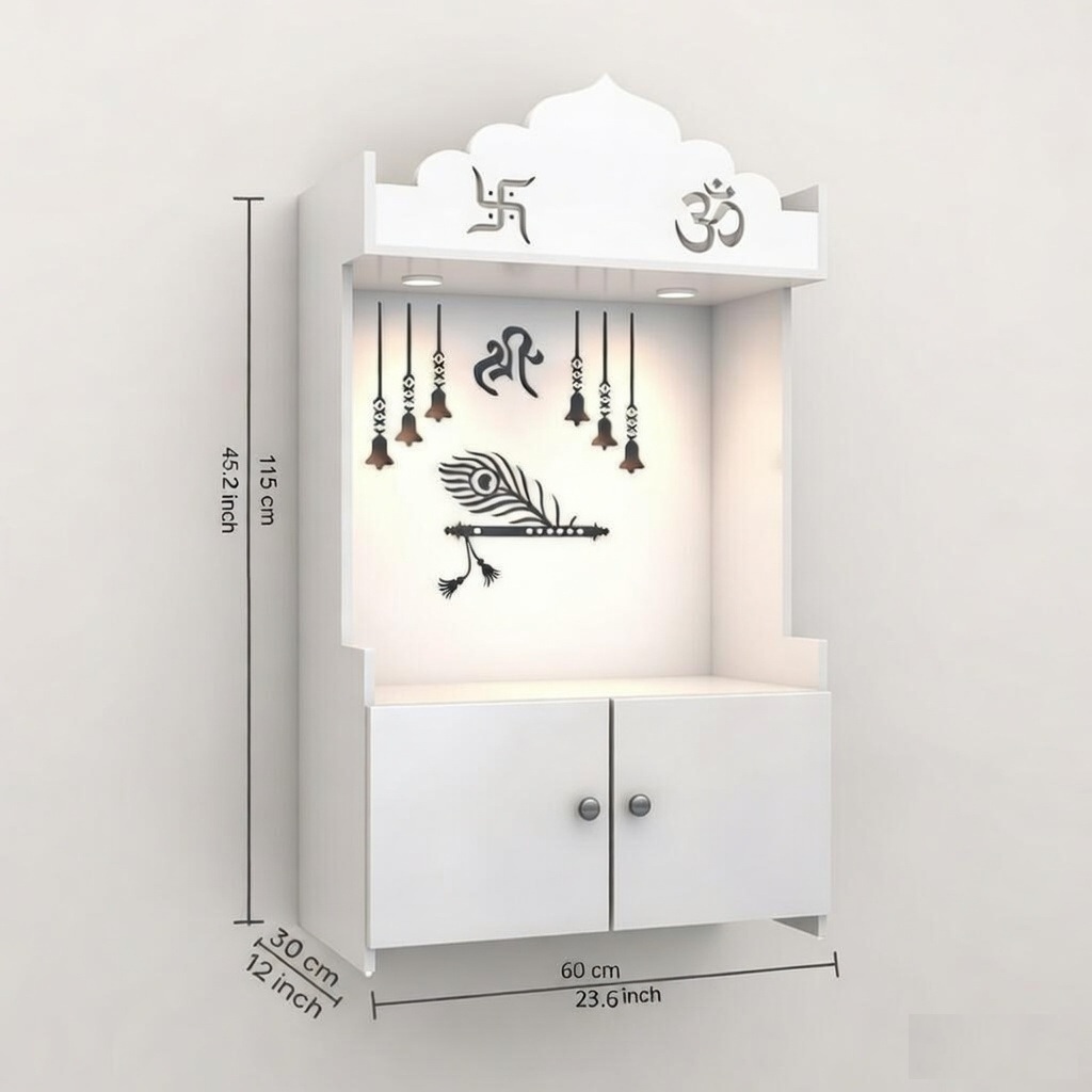MADHAVA Beautiful Wooden Pooja Stand for Home, Temple, Office, Wall Mounted Puja Mandir with LED Spot Light, Color ( White )