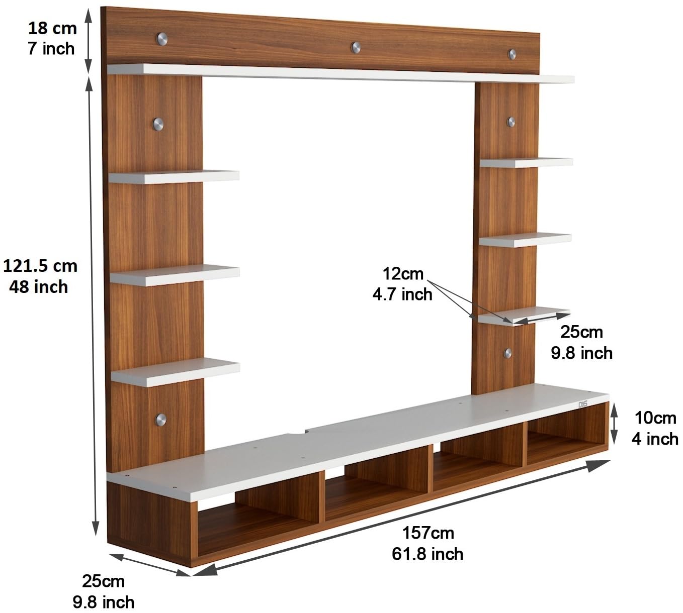 Material- 17mm Pre-laminated particle baord. Weight Capacity- 25 KG. Cable Management. Product Dimension- TV Cabinet- 157 x 25 x 13.4 CM, Wall Shelf- 25 x 12 CM, Shelf supporting Unit- 90 x 25 CM, Pop Up Shelf- 157 x 18 CM & 157 x 12 CM. Thickness Of Board- 17 MM, Weight- 21 KG