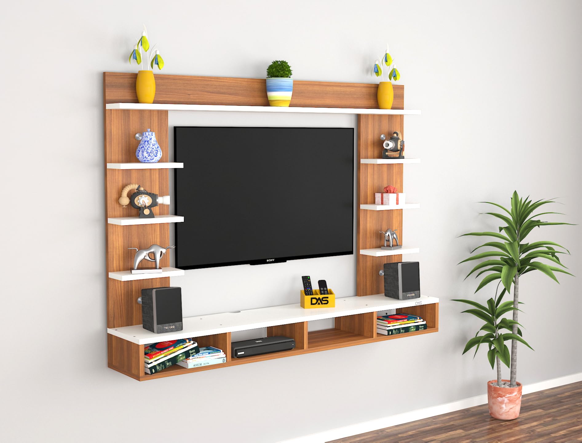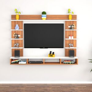 Merrill Engineered Wood Wall Mount TV Entertainment Unit/Tv Rack Set to Box Stand with Wall Shelves for Living Room Classic Walnut & Frosty White (Ideal for up to 43″) Screen