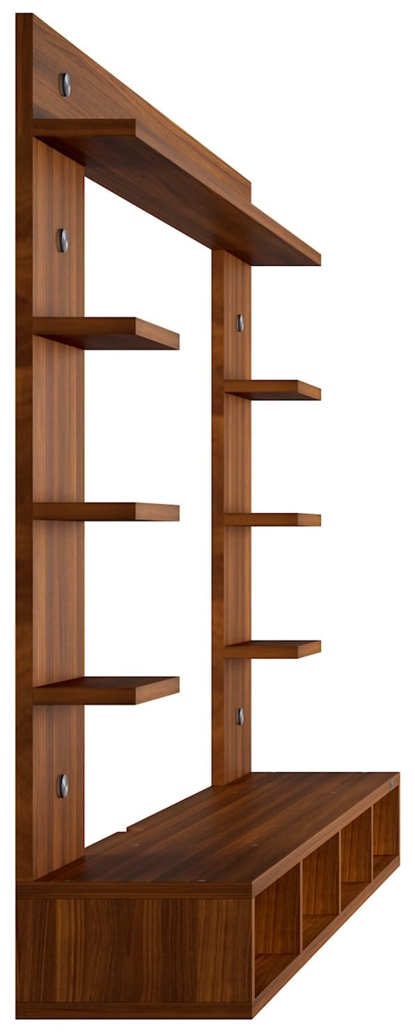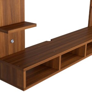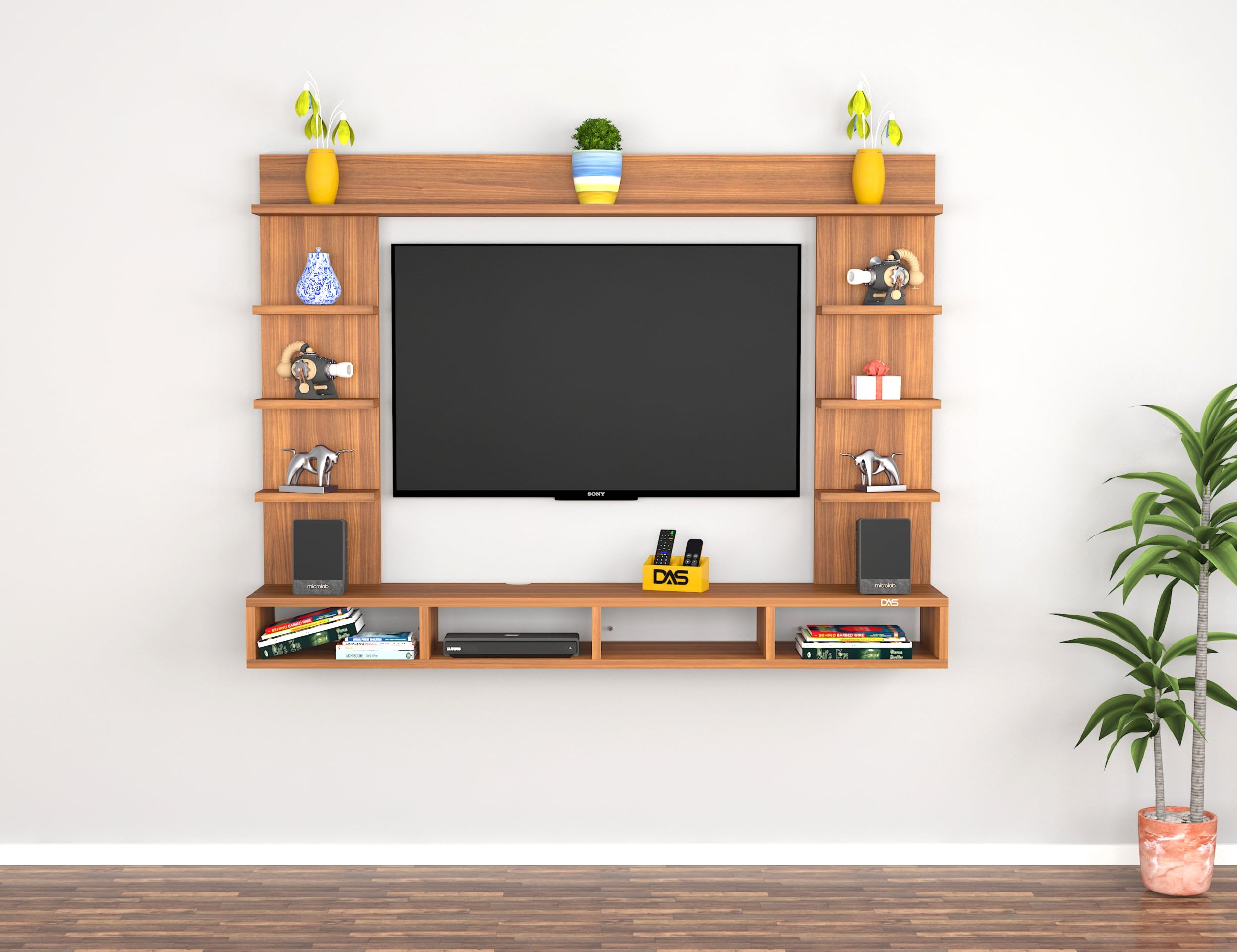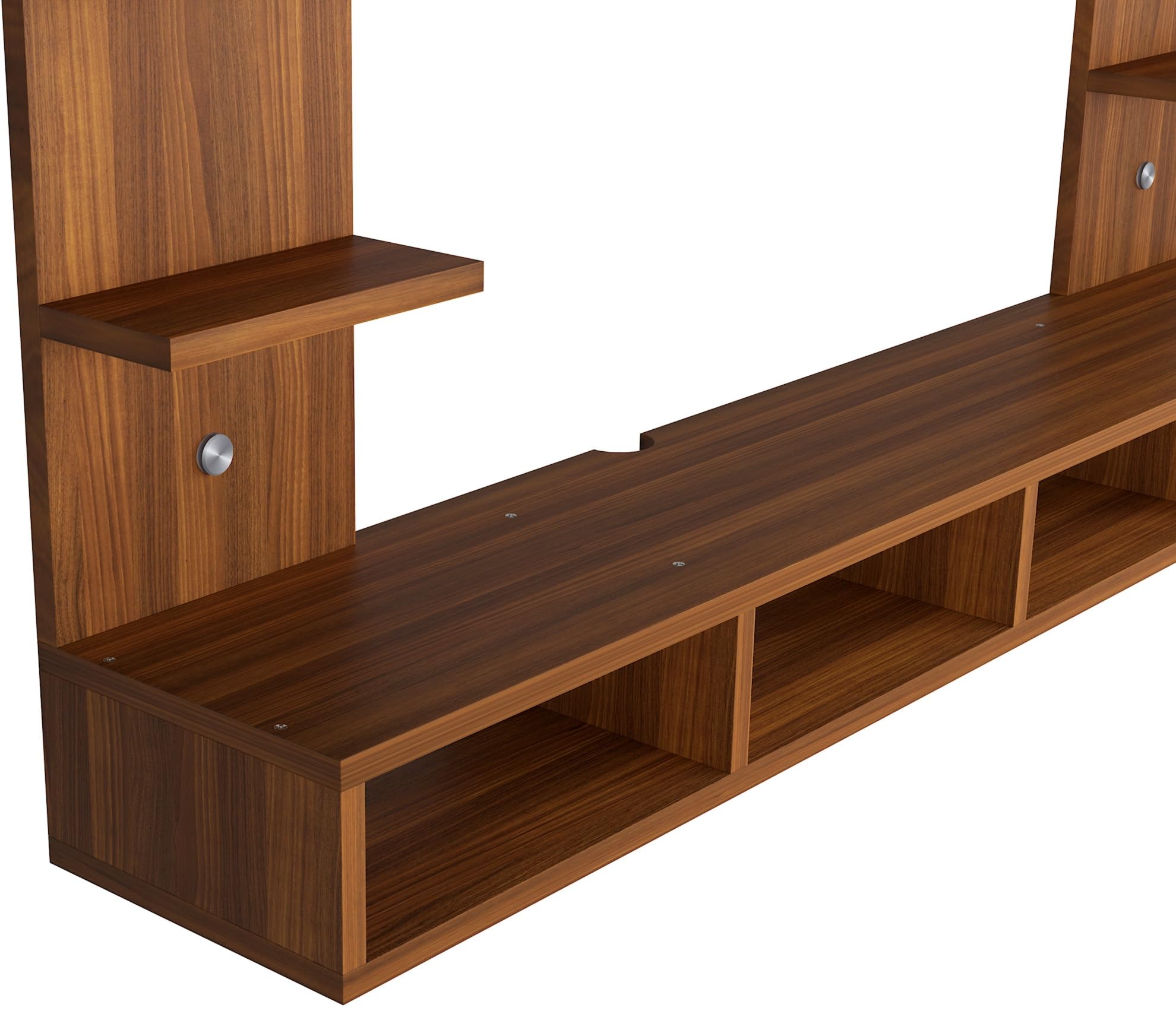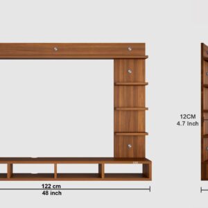 Material- Pre-laminated particle baord. Weight Capacity- 20 KG. Cable Management. Product Dimension- TV Cabinet- 122 x 20 x 15 CM, Wall Shelf- 20 x 12 CM, Shelf supporting Unit- 75 x 20 CM, Pop Out Shelf- 122 x 12 cm Weight- 12 KG