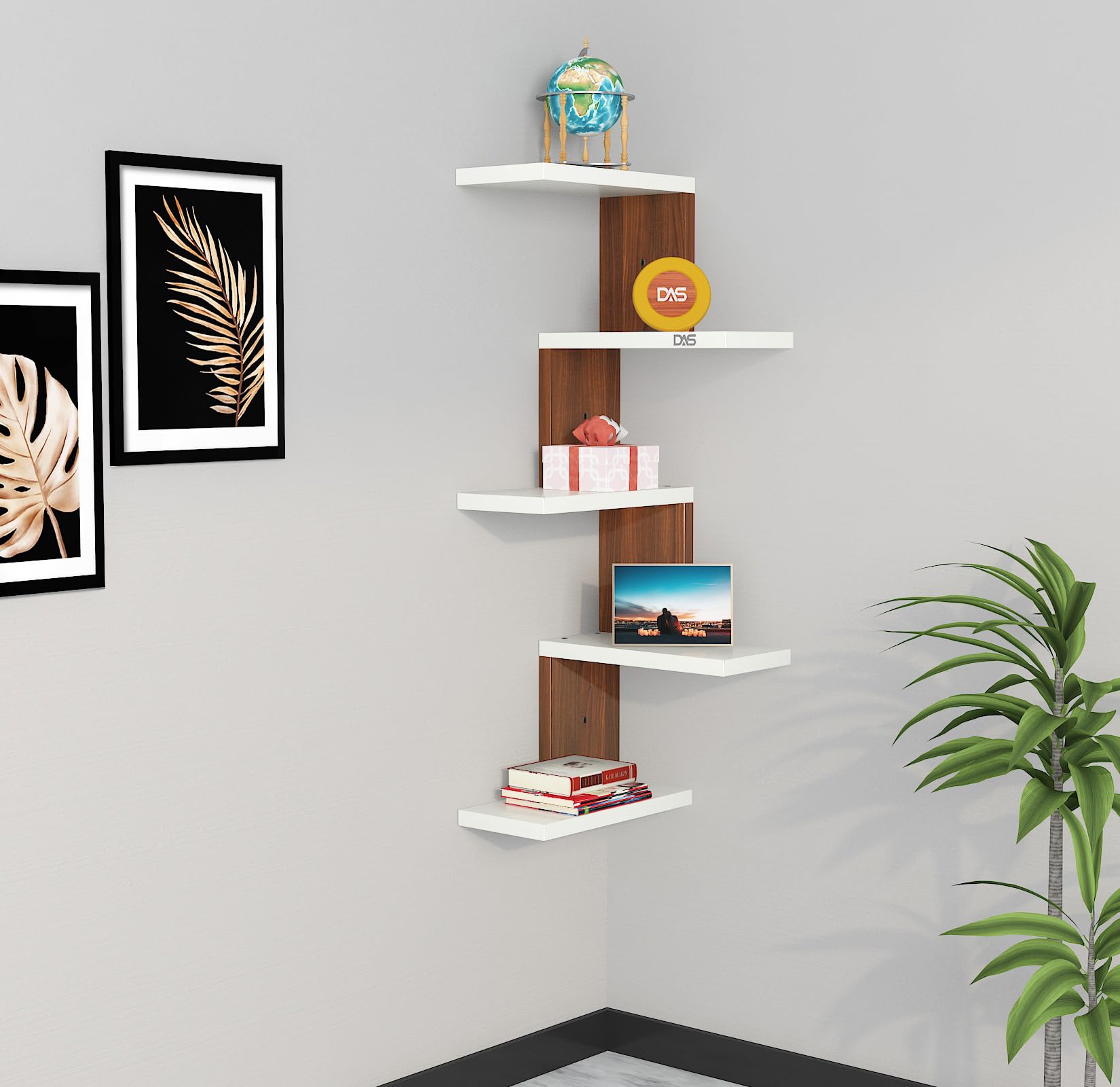Rikard Engineered Wood Wall Mount Corner Shelf Display Rack Unit for Living Room- Classic Walnut & Frosty White
