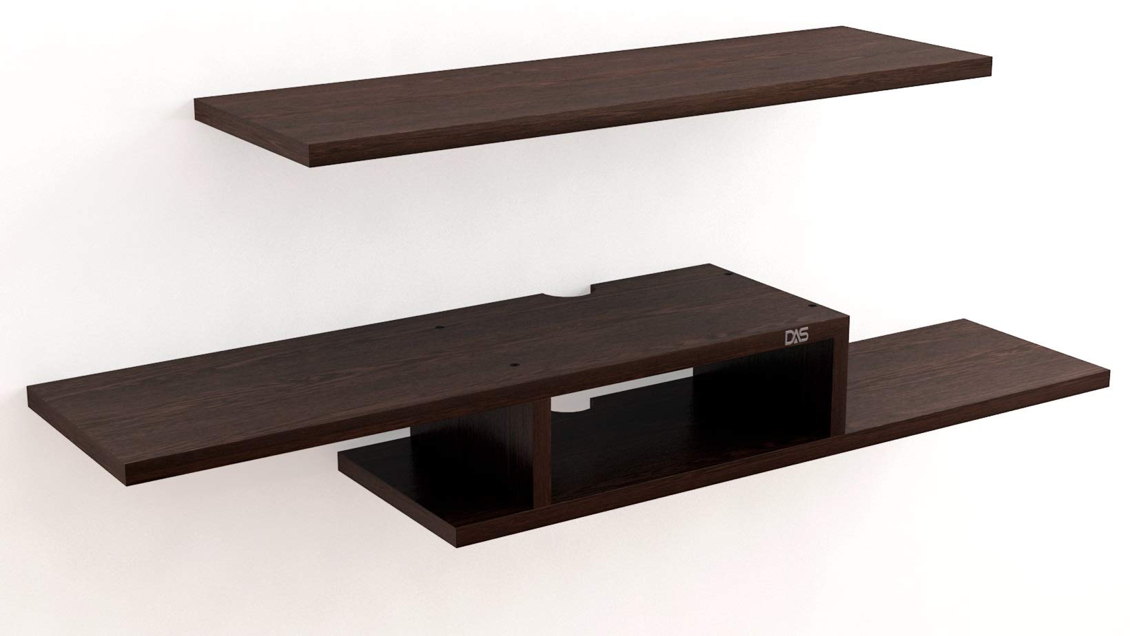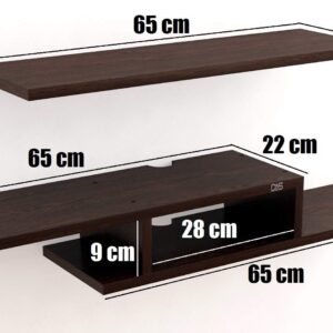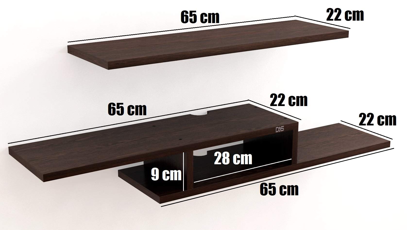 Product Dimension:- Length- 65 cm, Breadth- 22 cm, Height- 12.5 cm, Thickness Of Board- 1.7 cm || Dimensions Of Shelf:- Length- 65 cm, Breadth- 22 cm, Thickness- 1.7 cm. Material:- Engineered Wood || Colour- Wenge || Product Weight- 3.6 KG || Style- Contemporary || Installing Mechanism- Wall Mount || Application- Living Room.