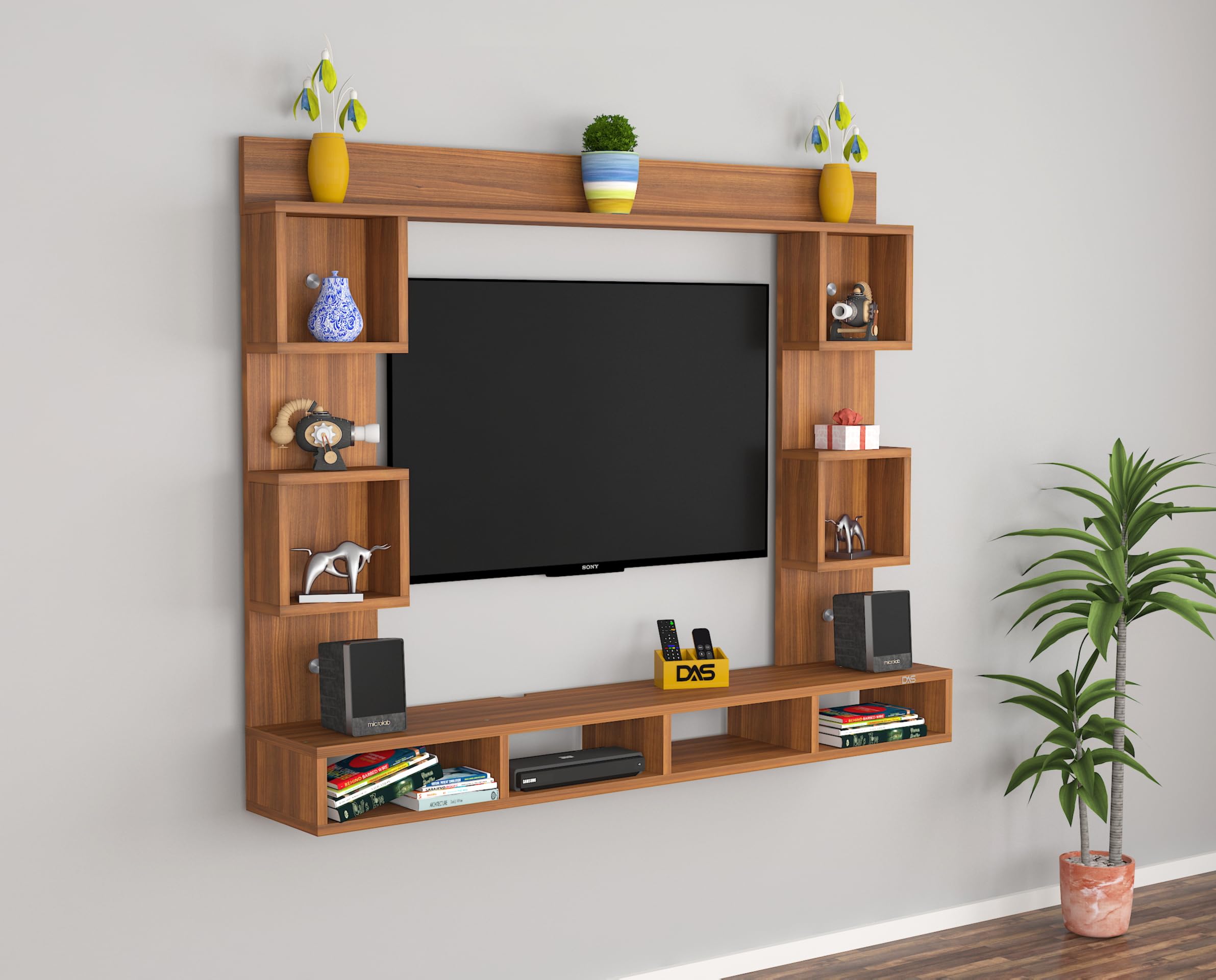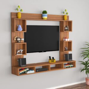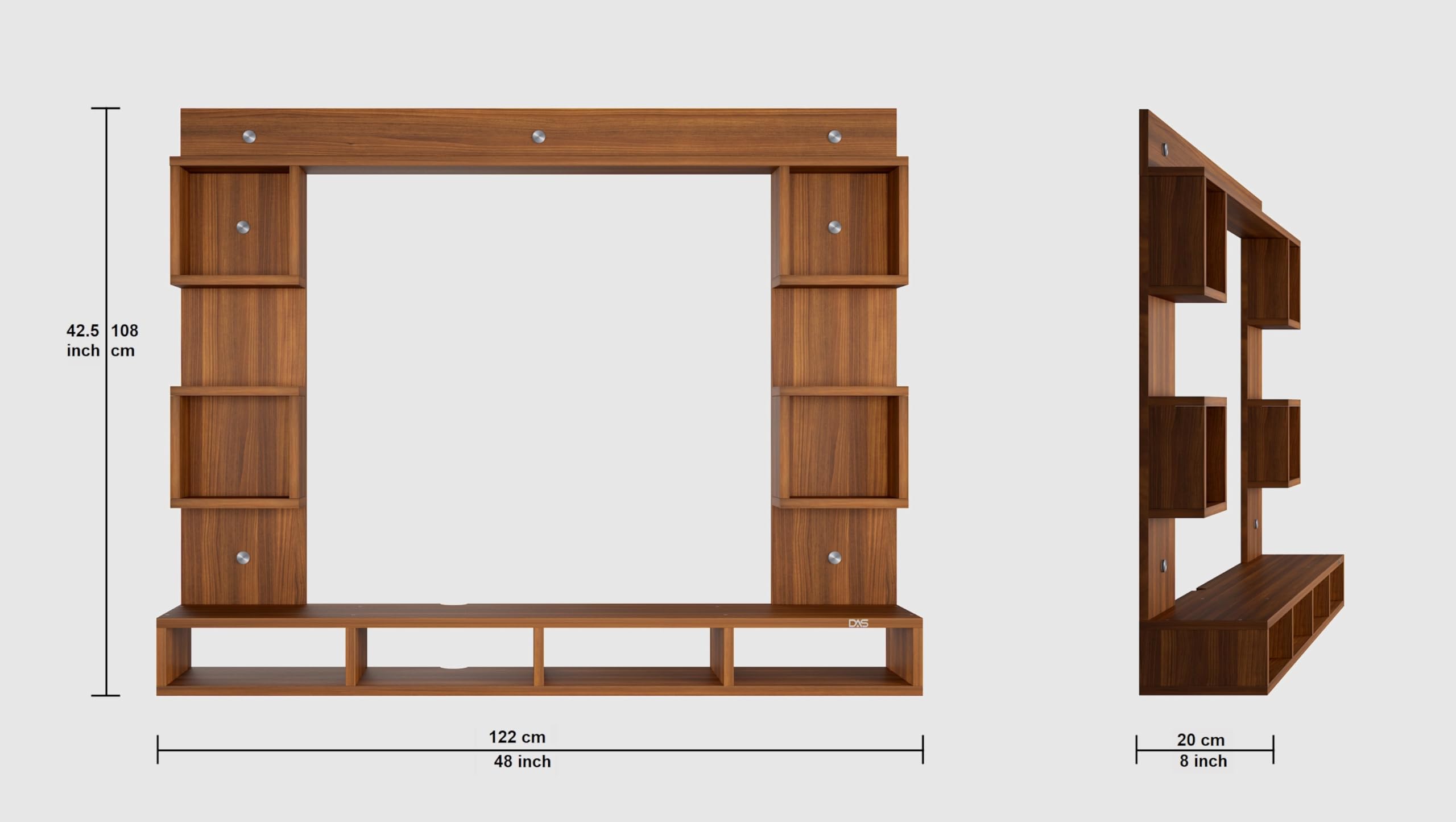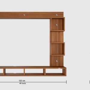 Material- Pre-laminated particle baord. Weight Capacity- 20 KG. Cable Management. Product Dimension- TV Cabinet- 122 x 20 x 15 CM, Wall Shelf- 20 x 12 CM, Shelf supporting Unit- 80 x 20 CM, Pop Out Shelf- 122 x 12 cm Weight- 12 KG